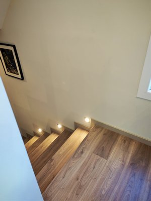 Helle Räume: Der Eingangsbereich ist einladend und beruhigend, führt zu eleganten Treppen, die ins Obergeschoss führen. Die Küche, offen zum Wohnzimmer, verfügt außerdem über eine Speisekammer/Waschküche mit direktem Ausgang nach außen.