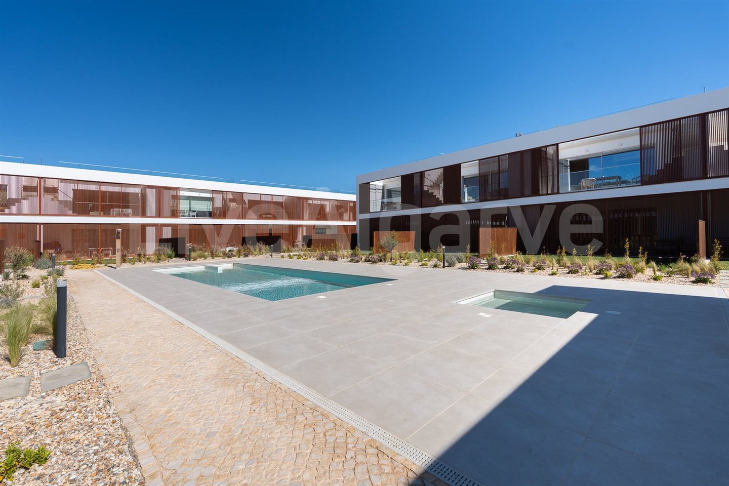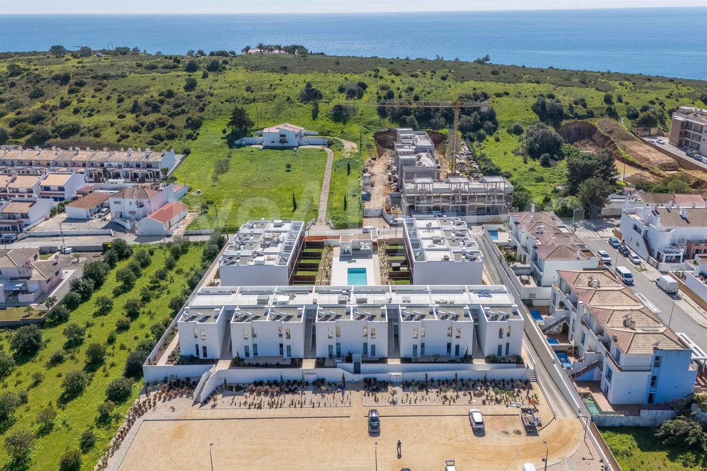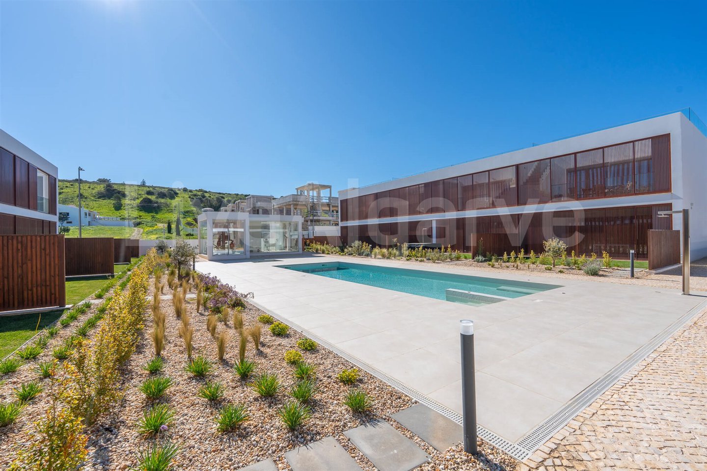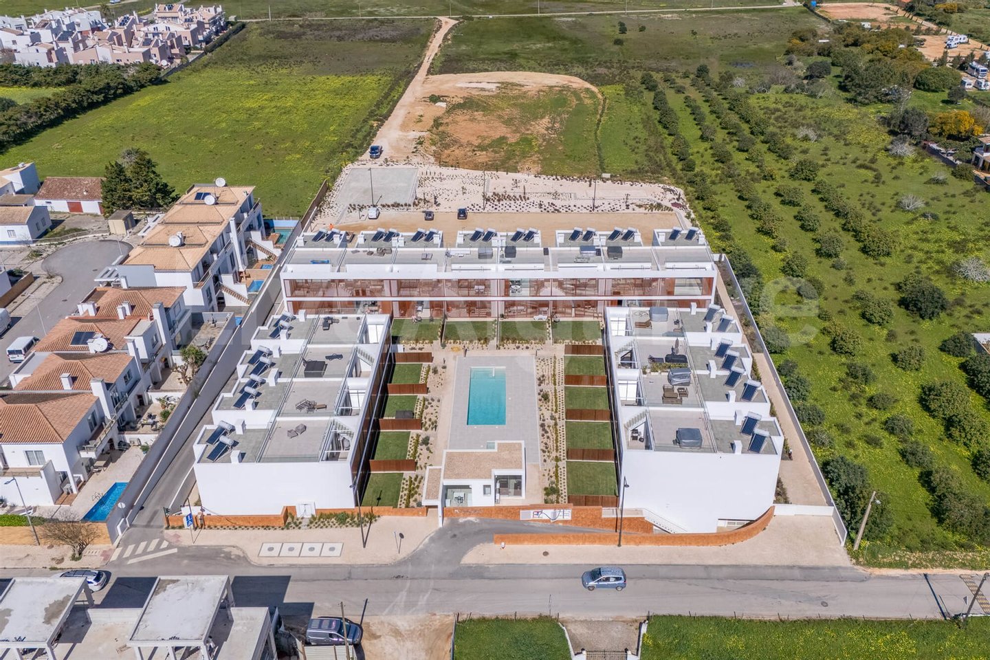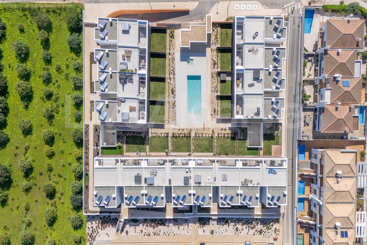 Die Wohnung gehört zu einem Wohnkomplex, der sich um einen zentralen Pool und einen Gemeinschaftsbereich gliedert. Die Gebäude sind südlich ausgerichtet, ein Layout, das die Sonneneinstrahlung auf den Außenflächen maximiert und gleichzeitig einen gewissen Schutz vor vorherrschenden Winden bietet.