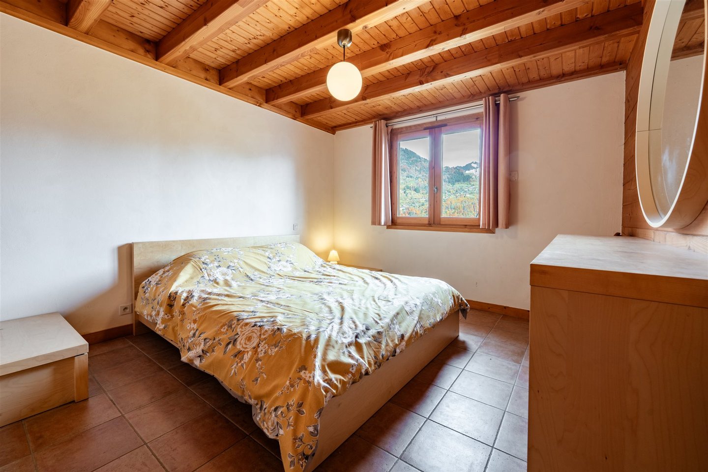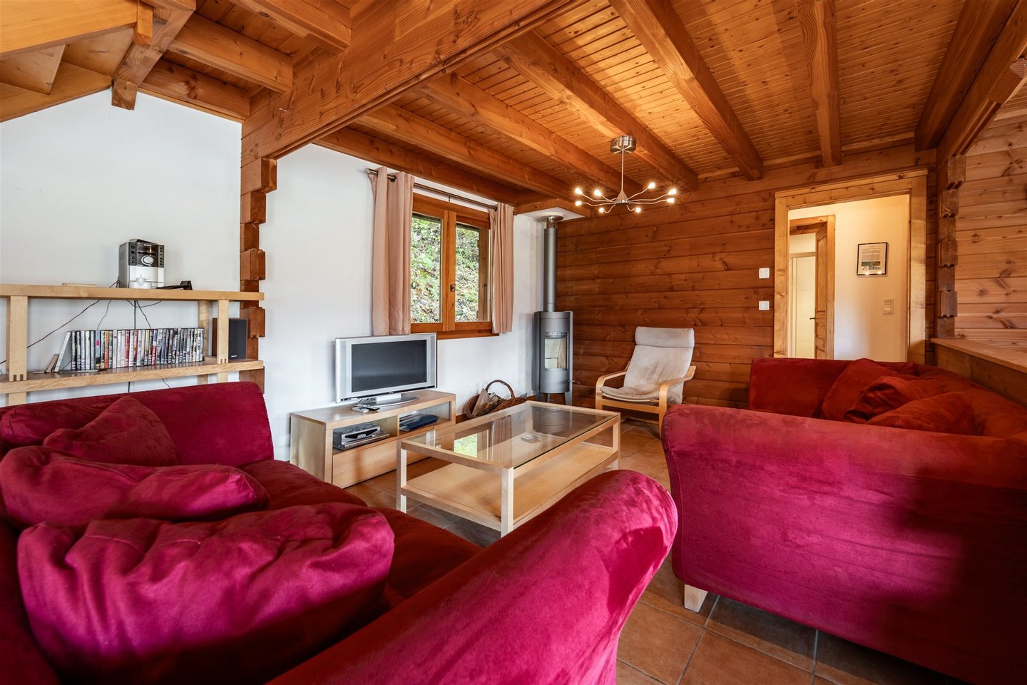 Im Obergeschoss gibt es eine offene Einbauküche mit herrlichem Blick auf Le Criou, einen Essbereich und einen Wohnzimmer mit Kaminofen, der zu einer hübschen holzernen Terrasse mit uneingeschränktem Blick auf die Gipfel führt. Ein Schlafzimmer mit eigenem Bad vervollständigt diese Etage.