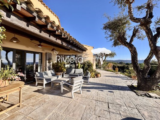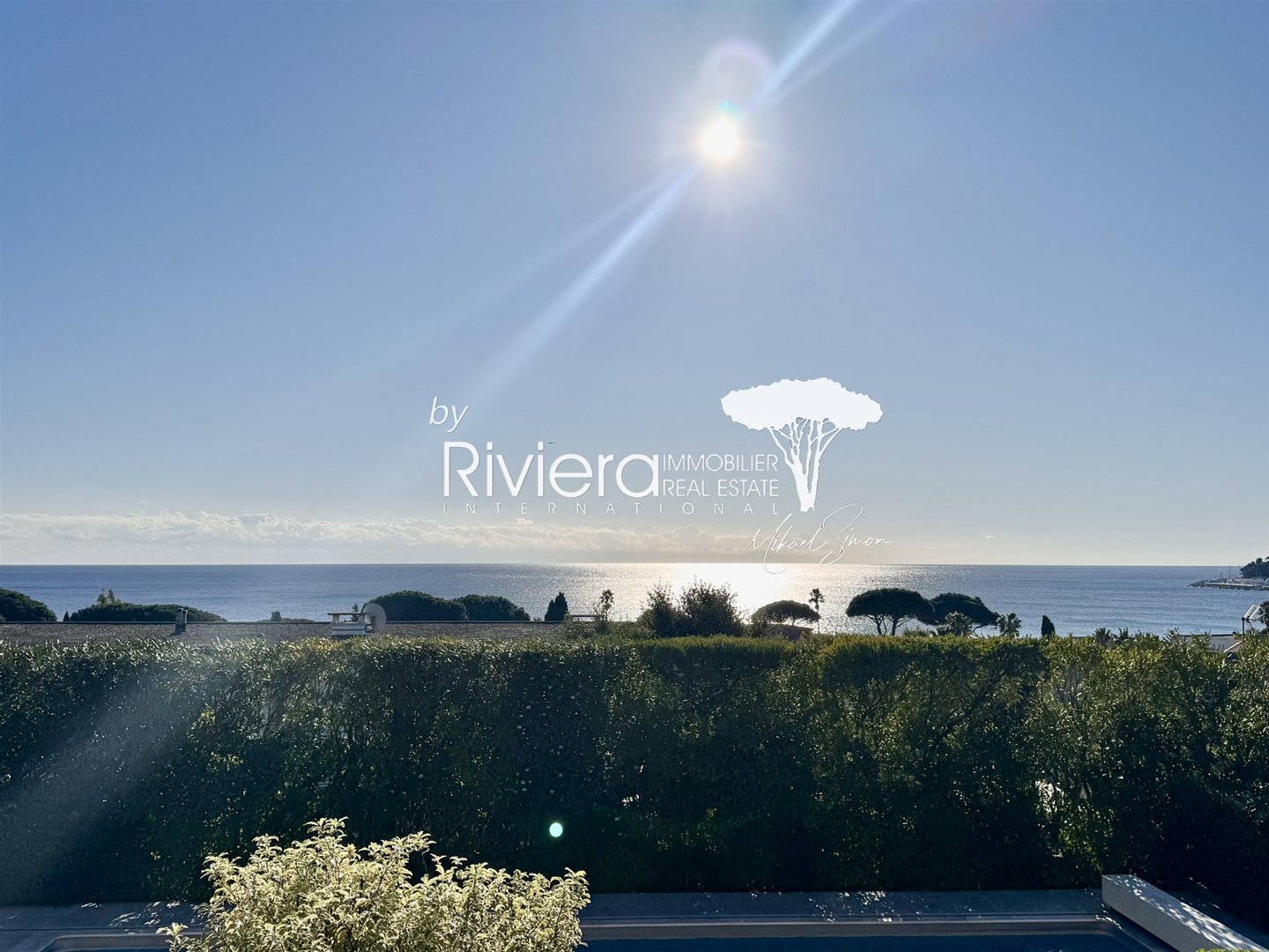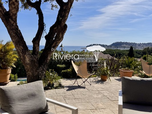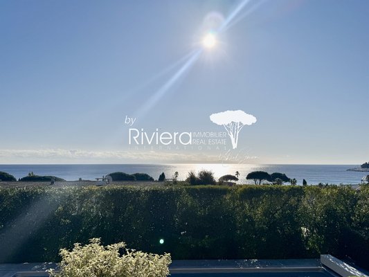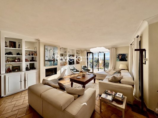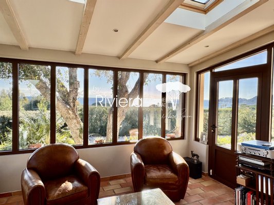 In einer kleinen, äußerst privaten Siedlung. Panorama-Meerblick und 200 m Fußweg zum Strand für diese Immobilie von ca. 180 m² auf einem vollständig begrünten Grundstück von 1330 m²! Sie bietet Ihnen einen großzügigen Wohn-/Essbereich von 56 m² mit