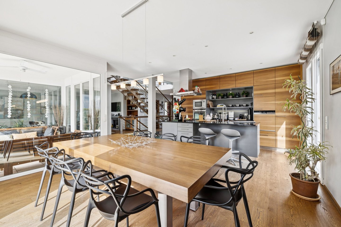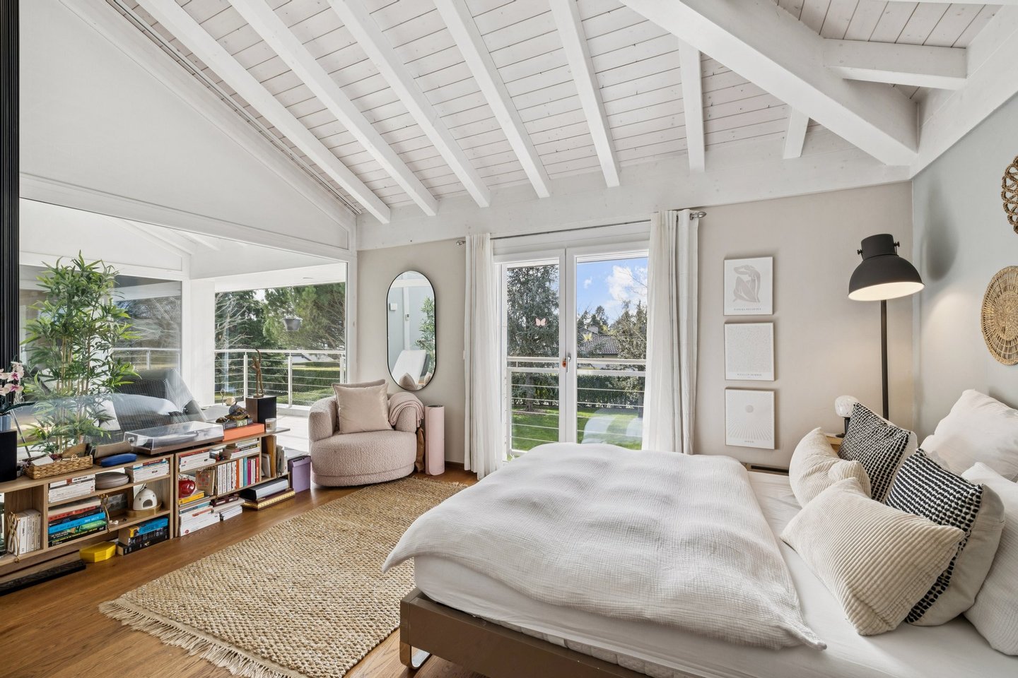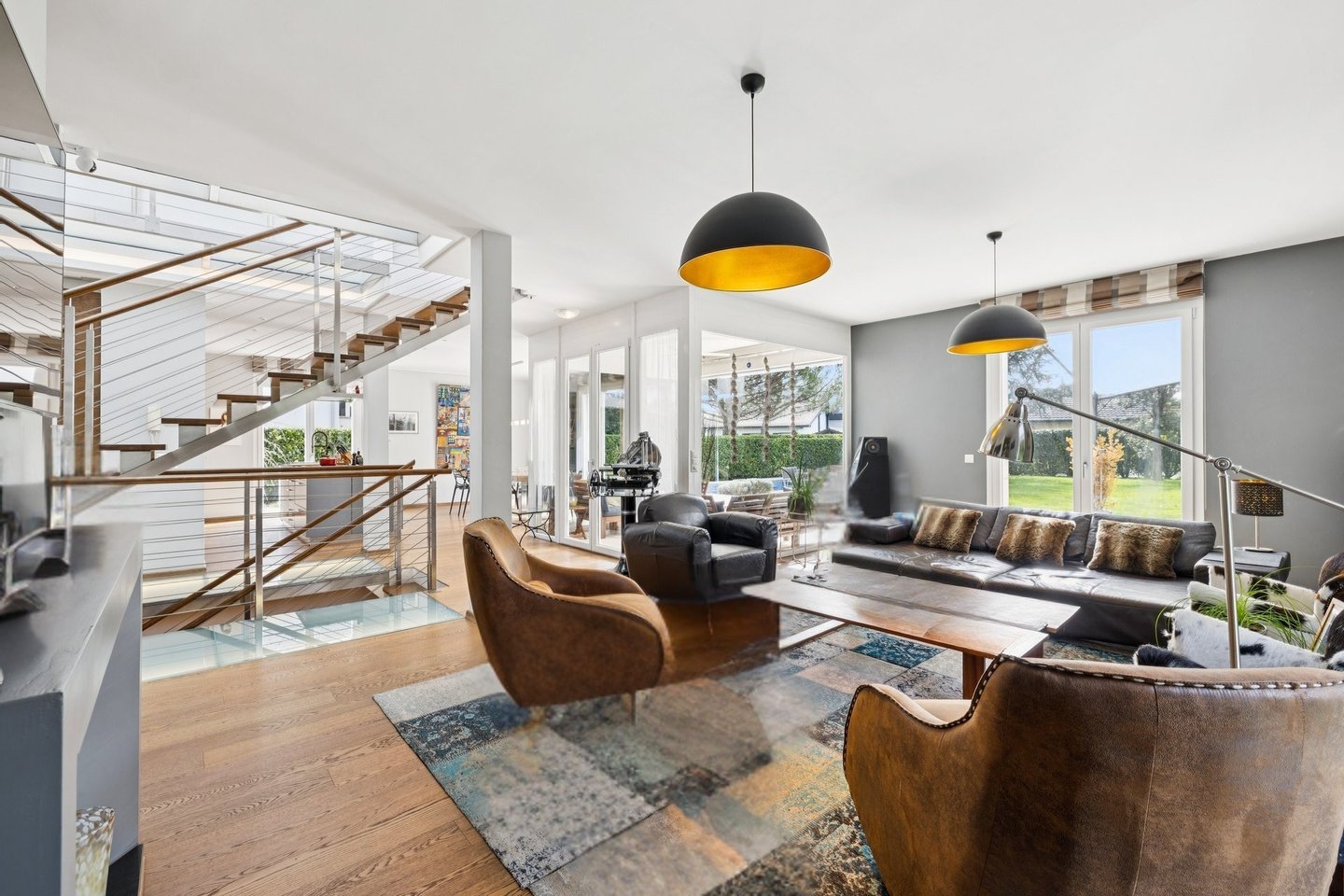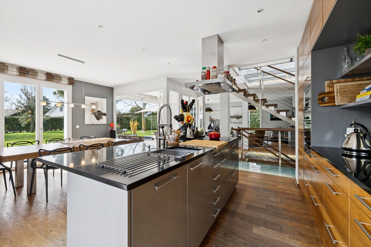 Das Atrium verkörpert eine zeitgenössische Vision eines außergewöhnlichen Zuhauses: einen Ort, an dem die Architektur verblasst und Bewegung und Klarheit weicht. Dieses einzigartige Anwesen zeichnet sich durch seine majestätischen Volumina, außergewöhnliche Deckenhöhe und besonders weitläufige Galerien aus. Dieses Design bietet ein unmittelbares Raumgefühl, ideal für ein dynamisches Familienleben. Die Verbindung zwischen den verschiedenen Ebenen wird durch eine hängende Treppe gewährleistet, deren schwebende Stufen ohne Stufen Aussicht und Licht das Haus von einem Ende zum anderen durchqueren. Das Erdgeschoss wurde als gemeinsamer Wohnraum konzipiert, sowohl praktisch als auch elegant. Vom Eingang aus ermöglicht eine separate Garderobe, die die tägliche Organisation der ganzen Familie diskret ermöglicht. Das geräumige Wohnzimmer mit Kamin und das Esszimmer werden durch Parkettböden mit breiten und tiefen Dielen bereichert, was eine warme und authentische Atmosphäre schafft. Die Küche, ein echtes Nervenzentrum, kommuniziert flüssig mit den Empfangsbereichen, während ein elegantes Büro und eine Gästesuite für perfekten Komfort bei der Arbeit oder bei der Beherbergung von Angehörigen sorgen. Oben nimmt das Konzept des Atriums seine volle Dimension an. Hier wird die Vertikalität mit spektakulärer Deckenhochachtung gefeiert, die am Gipfel des Deckes von einer Glaskonstruktion gekrönt wird. Dieser Lichtpavillon flutet das gesamte zentrale Atrium mit zenithaler Klarheit und schafft eine ständige Verbindung zum Himmel. Die Master Suite sticht als Zufluchtsort des Wohlbefindens hervor, mit einem maßgeschneiderten Umkleideraum und einem Badezimmer mit einem privaten Hammam. Drei weitere geräumige Schlafzimmer – eines mit eigenem Badezimmer – vervollständigen diese sonnenverwöhnte Ebene, ebenso wie eine überdachte Terrasse mit Blick auf den Garten. Die -1-Etage ist der aktiven Entspannung und Vielseitigkeit gewidmet. Ein großer multifunktionaler Raum beherbergt sowohl ein Heimkino als auch einen Fitnessbereich und bietet einen idealen Spielplatz für die Freizeit der Familie. Diese Ebene beinhaltet außerdem ein eigenständiges Studio mit privatem Eingang, Küche und Badezimmer, perfekt zum eigenständigen Aufnehmen von Freunden oder zur Unterbringung von Personal. Ein Weinkeller, eine Werkstatt und technische Räume sorgen für die perfekte Logistik des Hauses. Die Außenseiten sind eine natürliche Erweiterung dieser fließenden Architektur. Das Grundstück befindet sich auf einem 1.300 m² großen Grundstück, das von alten Bäumen geschützt ist, und öffnet sich zu einer weitläufigen, sonnigen Terrasse mit einem Grillplatz und einem Pool mit wechselnden Spiegelungen. In unmittelbarer Nähe zur Küche ermöglicht eine Terrasse das Essen im Freien, während ein angelegter Gemüsegarten die ganze Familie dazu einlädt, täglich frische Produkte zu genießen. Das Ensemble wird durch ein elektrisches Tor gesichert und verfügt über einen Doppelcarport, einen Fahrradabstellraum und einen Gartenschuppen, der perfekt den Bedürfnissen eines aktiven und ruhigen Lebens in Coppet entspricht. Coppet ist eine begehrte Gemeinde an der Vaud-Riviera, nur 15 Minuten von Genf und ihrem internationalen Flughafen entfernt. Gut an Zug und Autobahn angebunden, bietet es sowohl die Ruhe eines historischen Dorfes am Ufer des Genfersees als auch unmittelbare Nähe zu allen Annehmlichkeiten. Verkehr und Einrichtungen