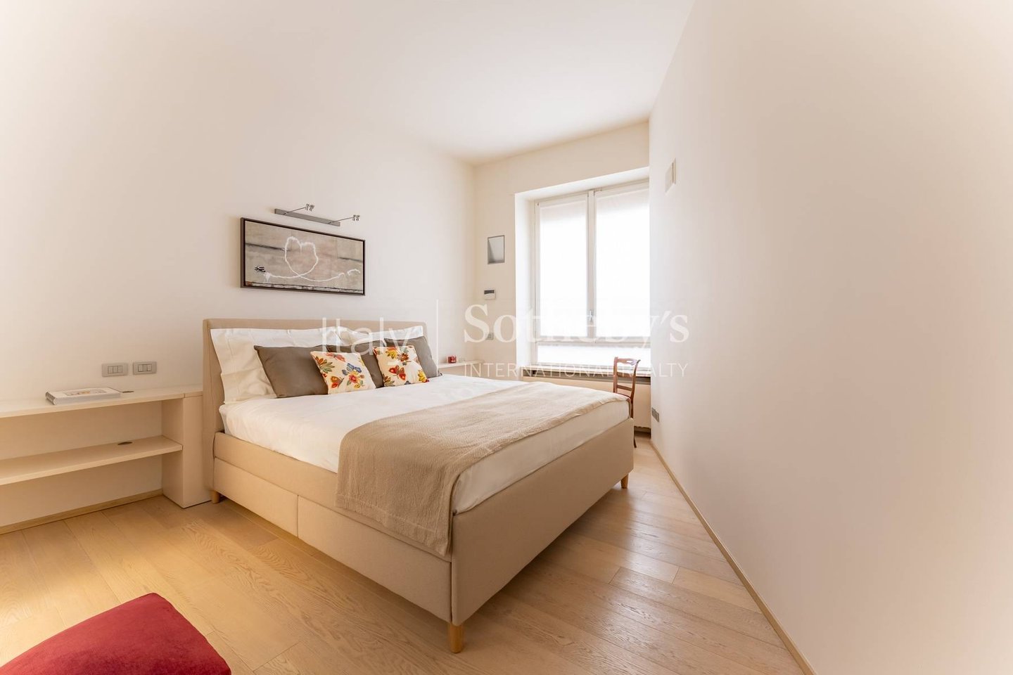 The sleeping area, well separated by a hallway, includes a master bedroom with a king-size bed and en-suite walk-in wardrobe, as well as a second room arranged with a single bed and desk, also ideal as a study. The property is completed by two modern bathrooms, one with a shower and bathtub, the other with a shower, both finely finished.