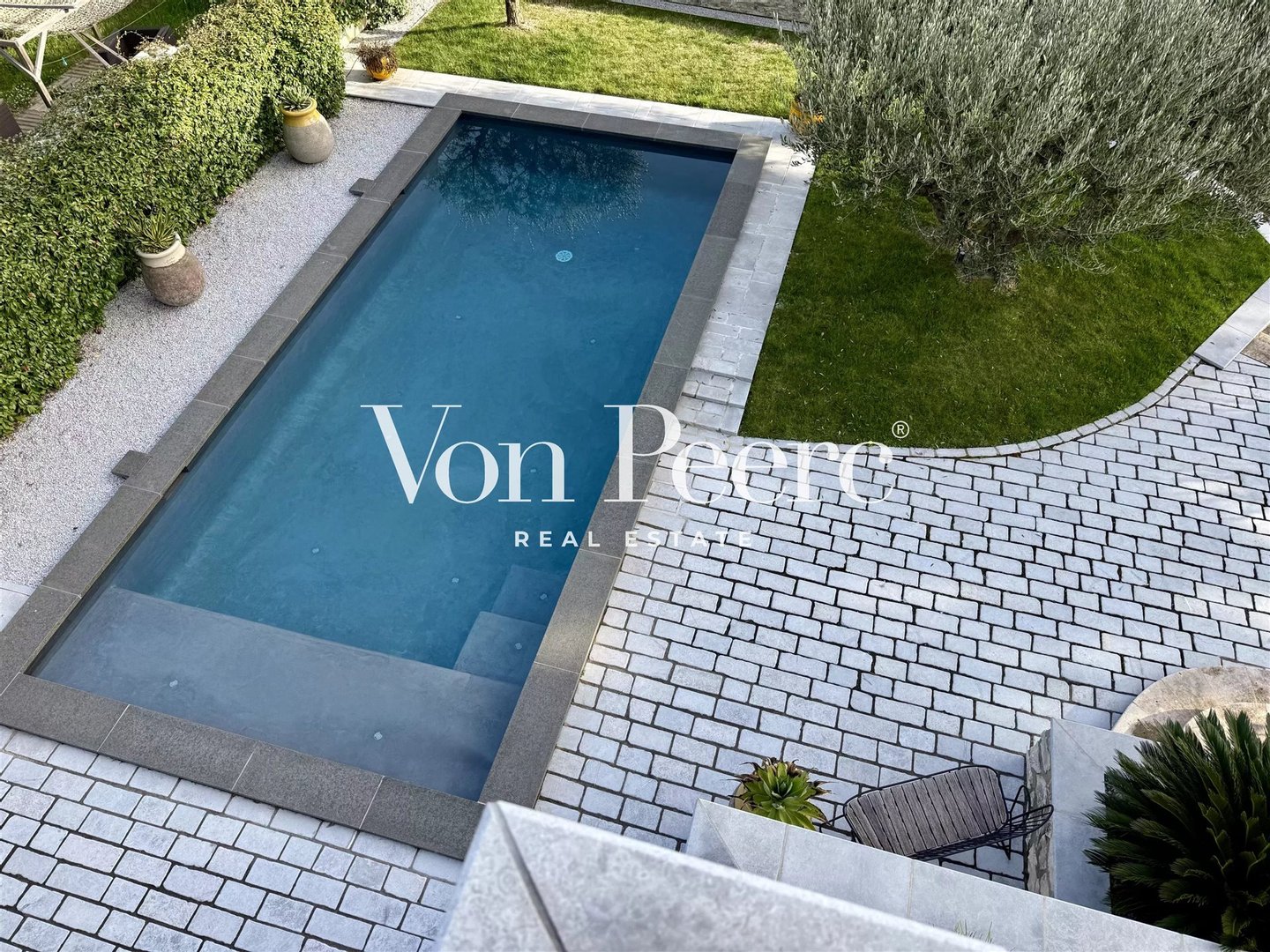 Das Haus öffnet sich zu einem angenehmen Garten von ca. 850 m², sorgfältig gestaltet, mit Pool und verschiedenen Entspannungsbereichen, die sowohl Gemeinschaft als auch ruhige Momente fördern.