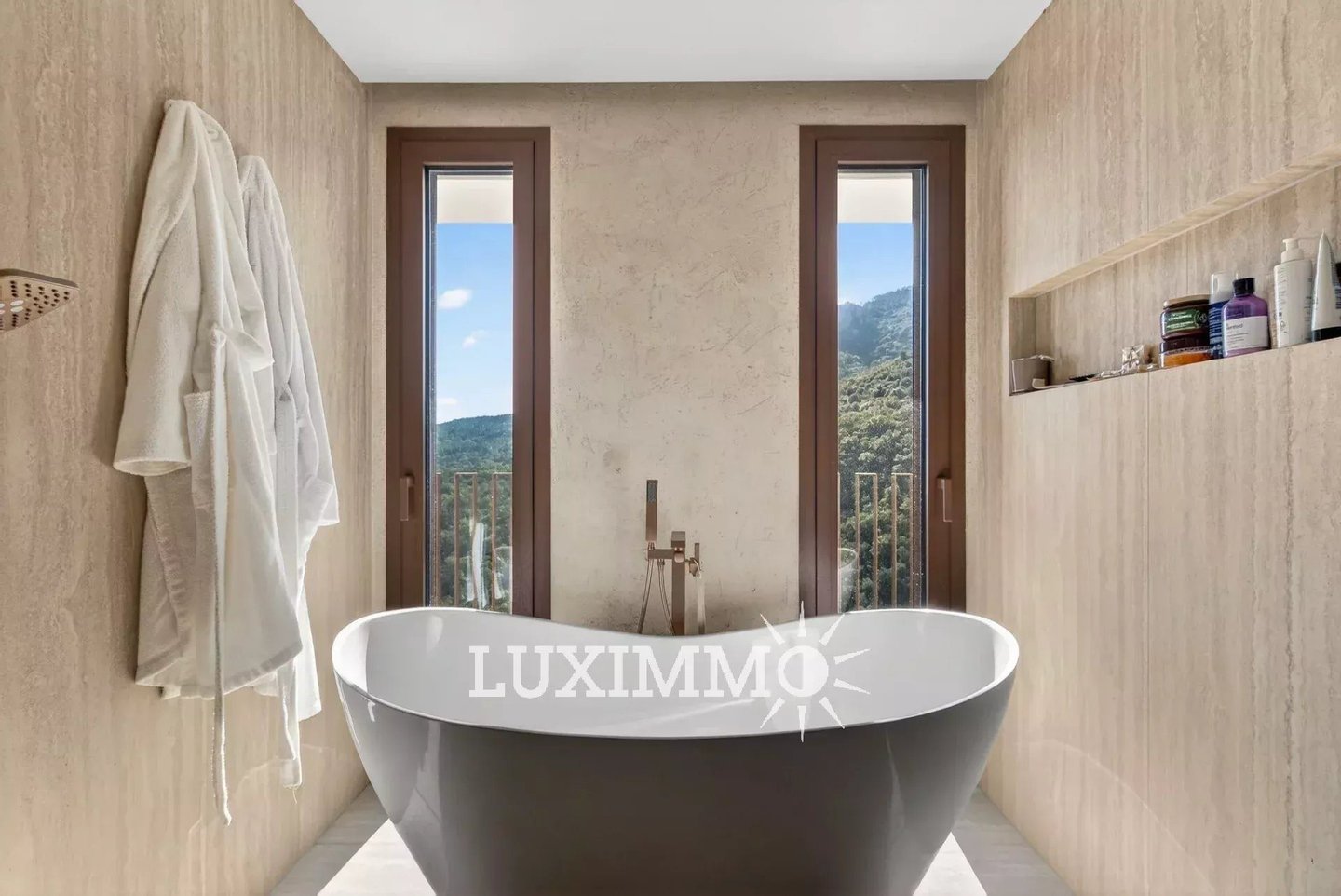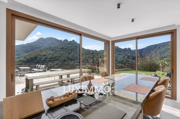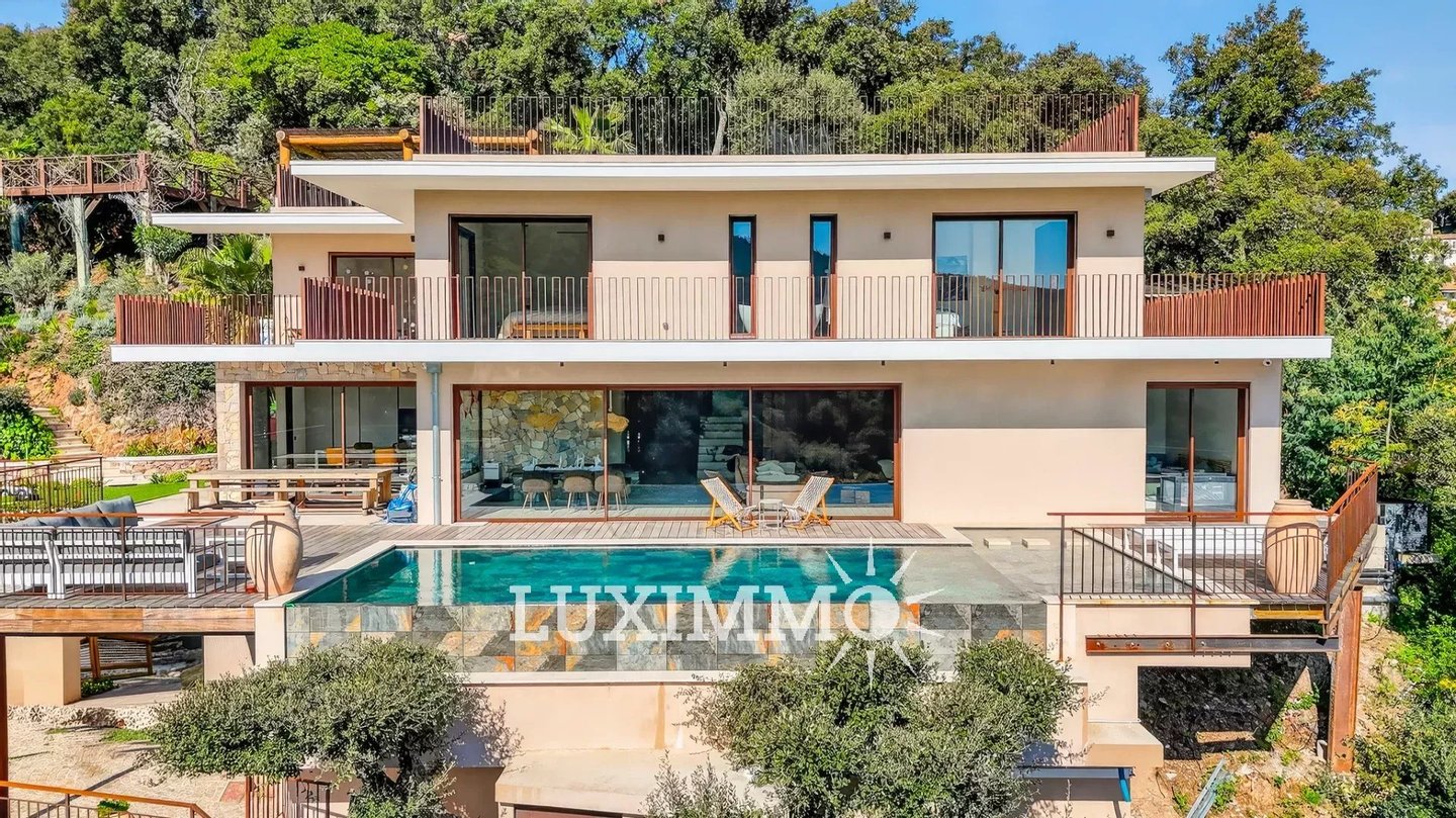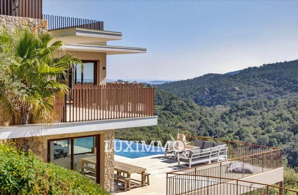 Mandelieu – In einer sicheren Anlage, in absoluter Ruhe gelegen, nur 15 Minuten von Stränden und dem Hafen La Napoule entfernt, mit Panoramablick: Diese zeitgenössische Villa mit 318 m² steht auf einem Grundstück von 2100 m² mit beheiztem Pool.