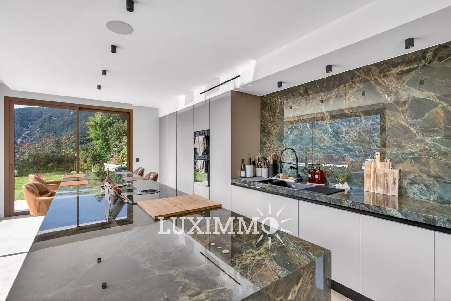 Erdgeschoss: 1 großes Wohnzimmer mit Essbereich, 1 offene amerikanische Küche zur Terrasse, 1 Master-Schlafzimmer mit Ankleidezimmer und Bad.