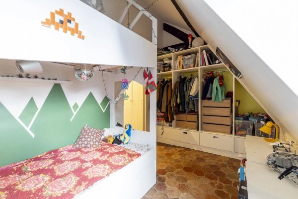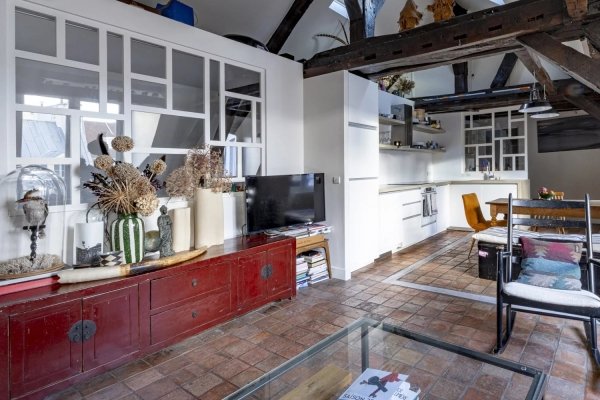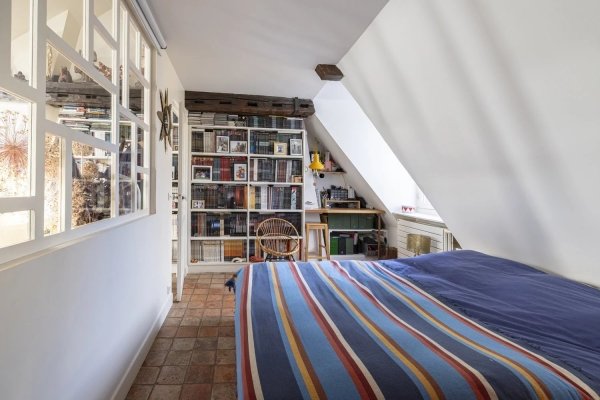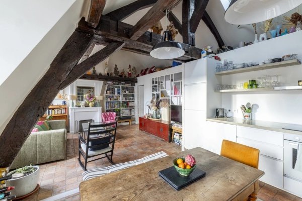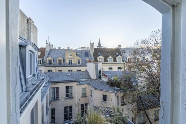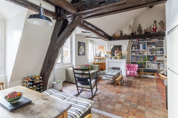 Im Herzen von Saint-Germain-des-Prés, im 4. und obersten Stockwerk eines Gebäudes aus dem 18. Jahrhundert ohne Aufzug, zwischen Hof und Garten, befindet sich eine doppelläufige Wohnung mit Blick nach Norden und Süden mit einer Fläche von 65 m².