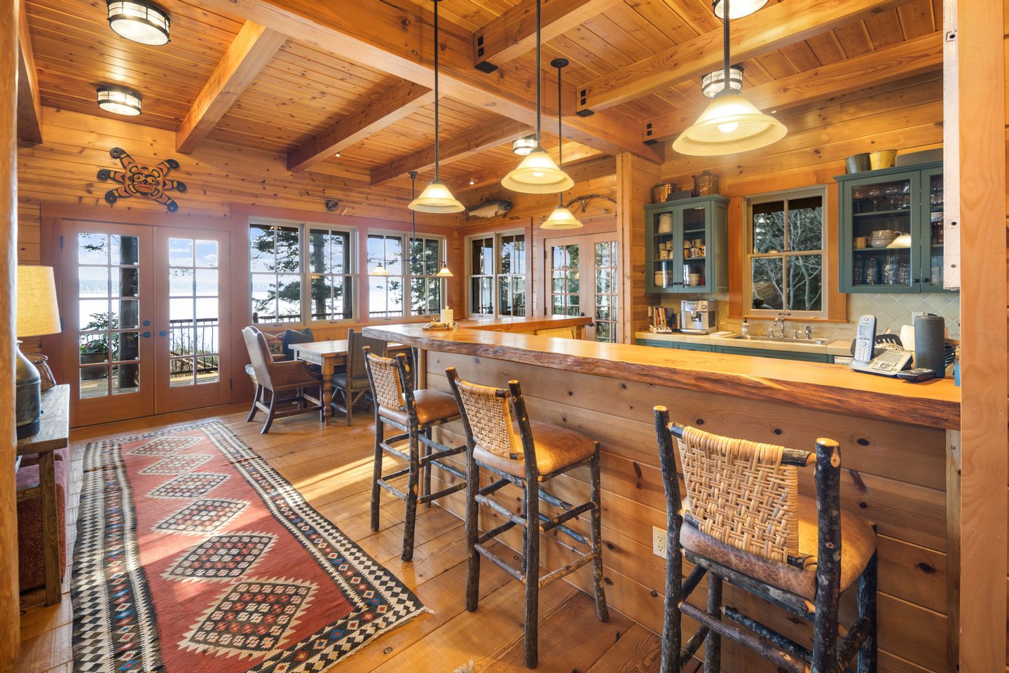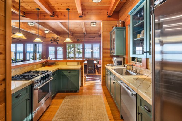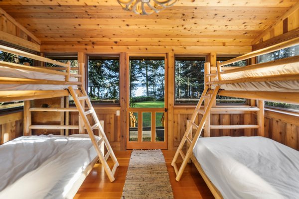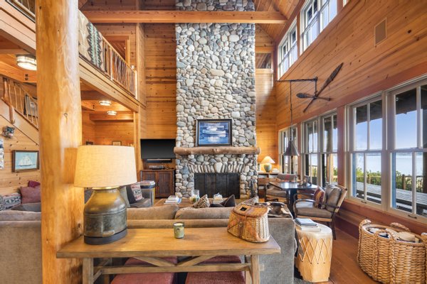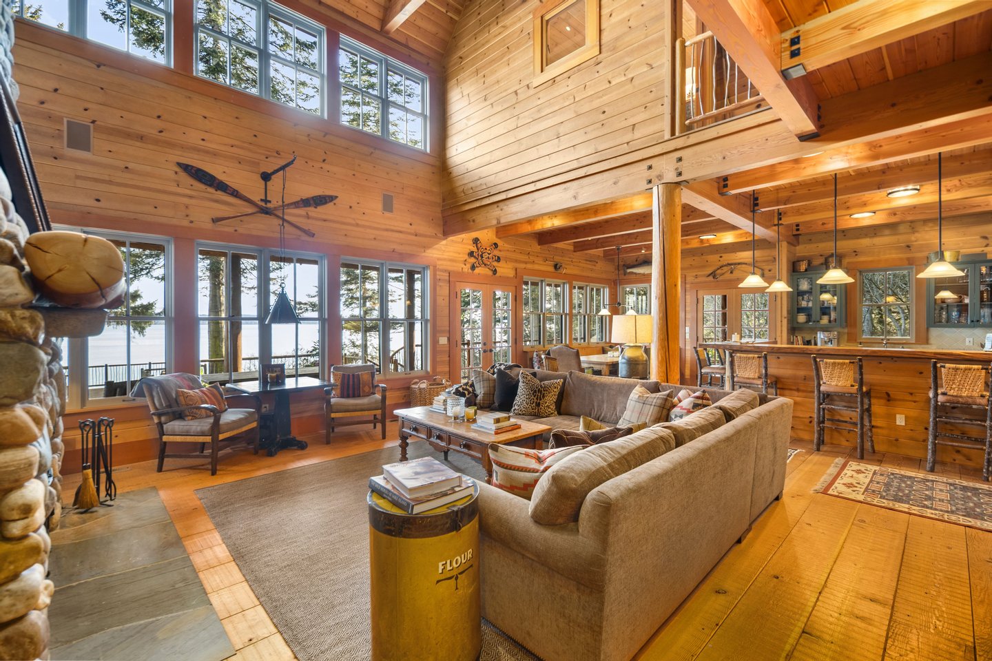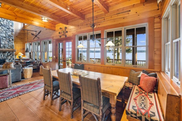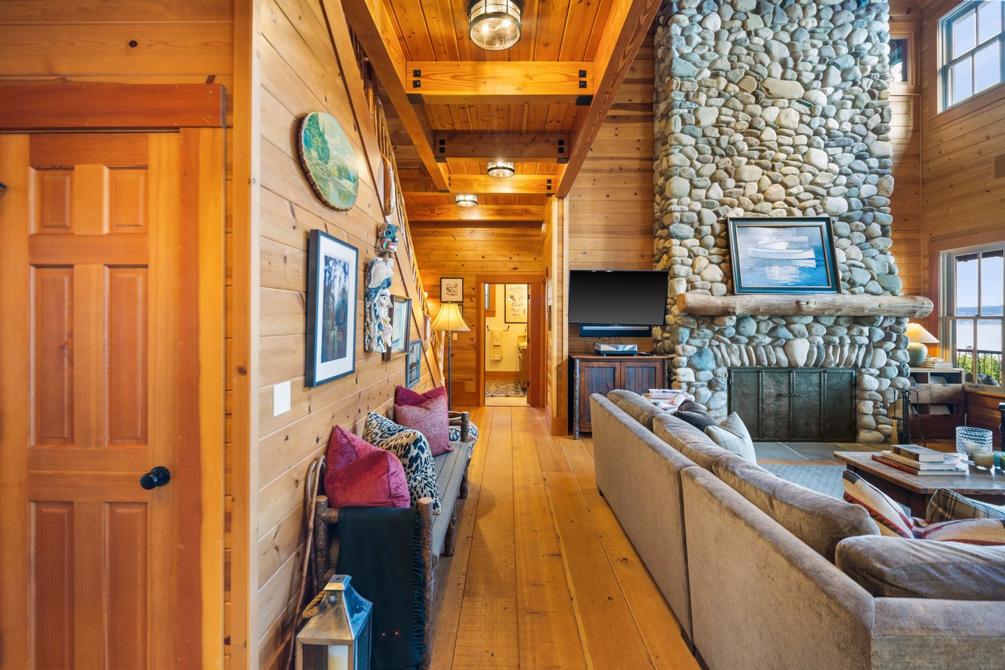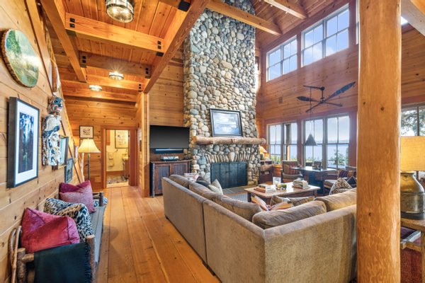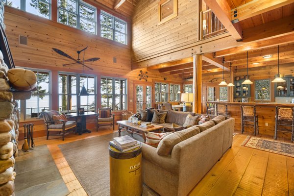 Das 2.590 Quadratfuß große Haus zeichnet sich durch seinen hohen großen Raum mit freiliegenden Douglasienträgern, Nut-und-Feder-Zedernholzvertäfelungen und breiten Tannenboden aus. Ein markanter 30 Fuß hoher Kamin aus Flussfelsen verankert den Raum, während weitläufige holzbezogene Fenster einen weiten Blick auf das Wasser nach Südosten einrahmen.