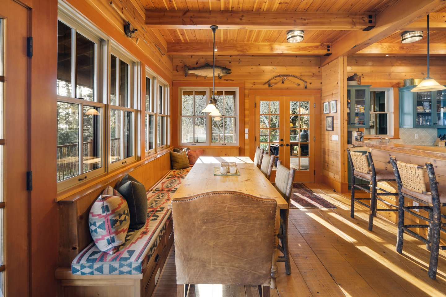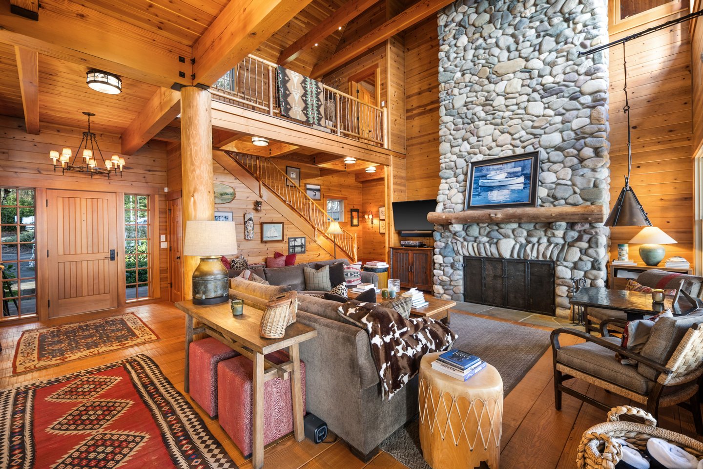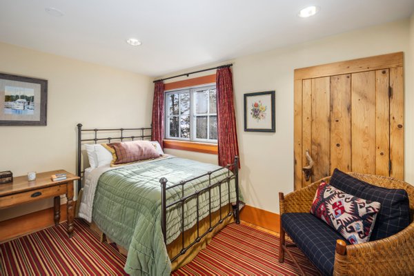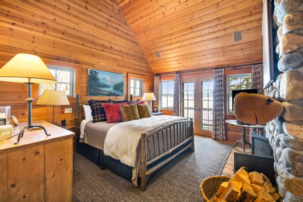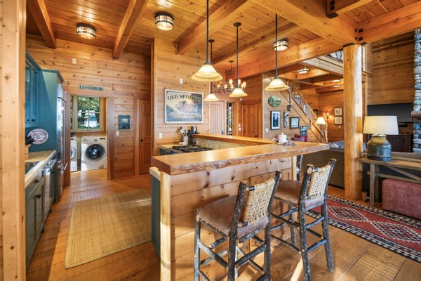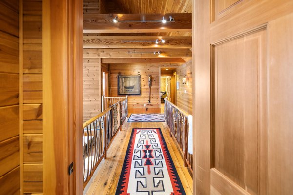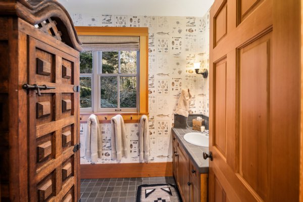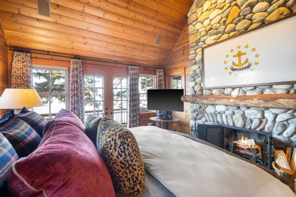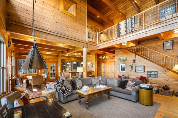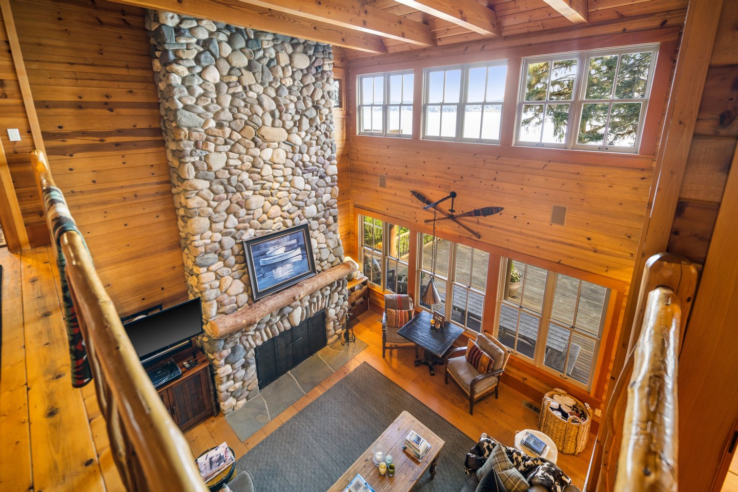 Das 2.590 Quadratfuß große Haus zeichnet sich durch seinen hohen großen Raum mit freiliegenden Douglasienträgern, Nut-und-Feder-Zedernholzvertäfelungen und breiten Tannenboden aus. Ein markanter 30 Fuß hoher Kamin aus Flussfelsen verankert den Raum, während weitläufige holzbezogene Fenster einen weiten Blick auf das Wasser nach Südosten einrahmen.