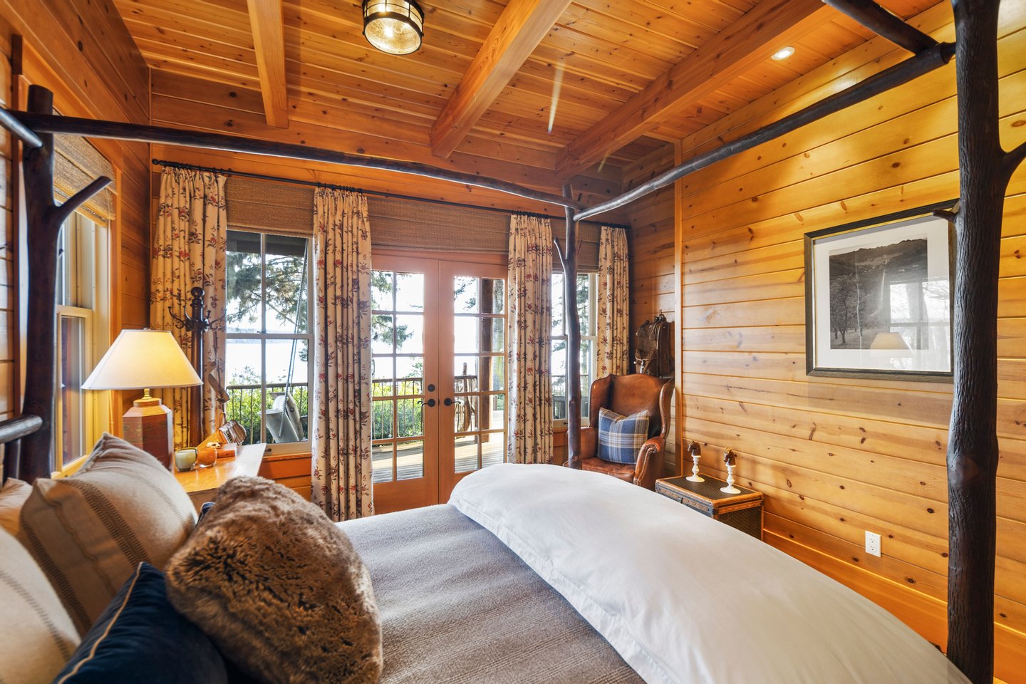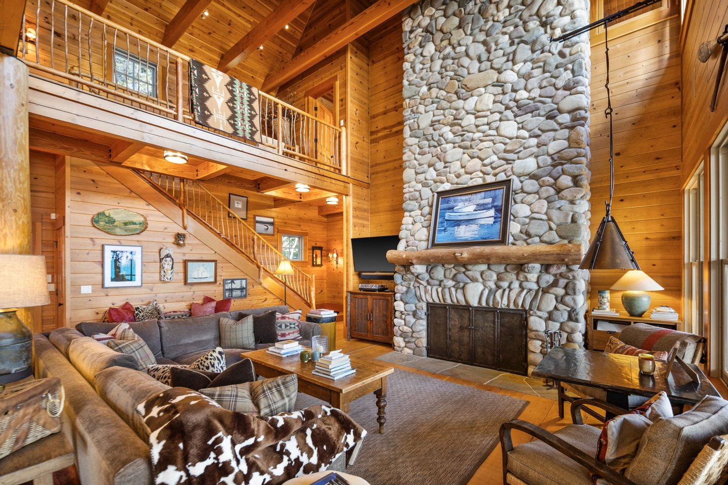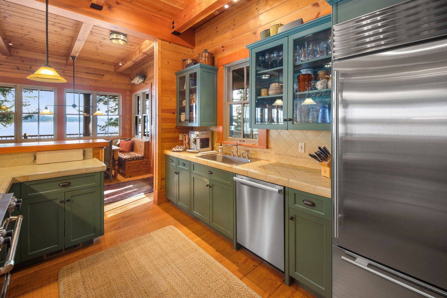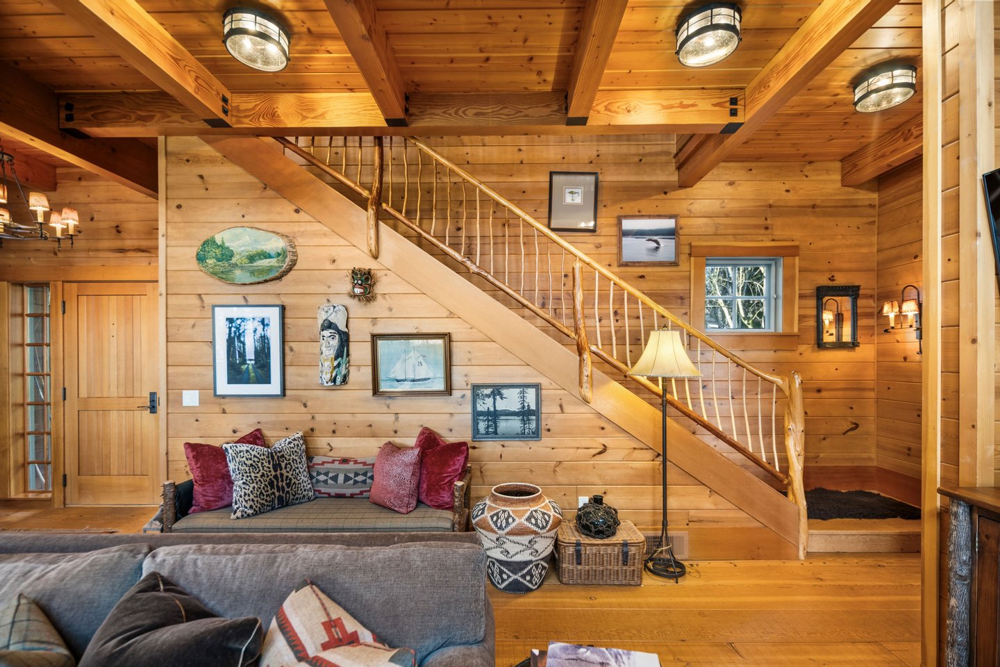 Das 2.590 Quadratfuß große Haus zeichnet sich durch seinen hohen großen Raum mit freiliegenden Douglasienträgern, Nut-und-Feder-Zedernholzvertäfelungen und breiten Tannenboden aus. Ein markanter 30 Fuß hoher Kamin aus Flussfelsen verankert den Raum, während weitläufige holzbezogene Fenster einen weiten Blick auf das Wasser nach Südosten einrahmen.