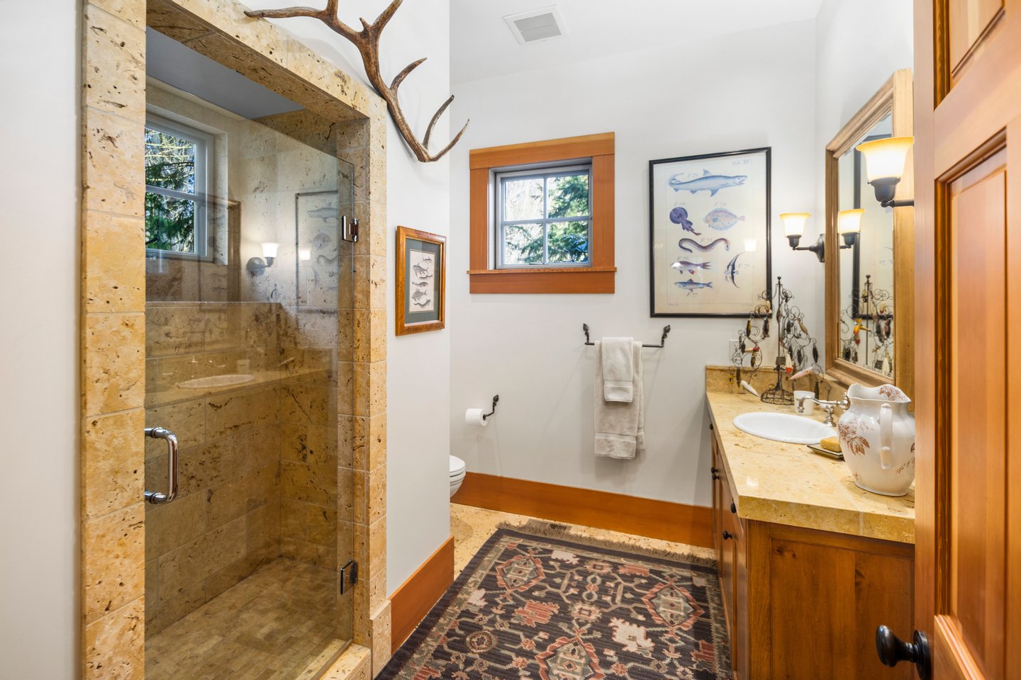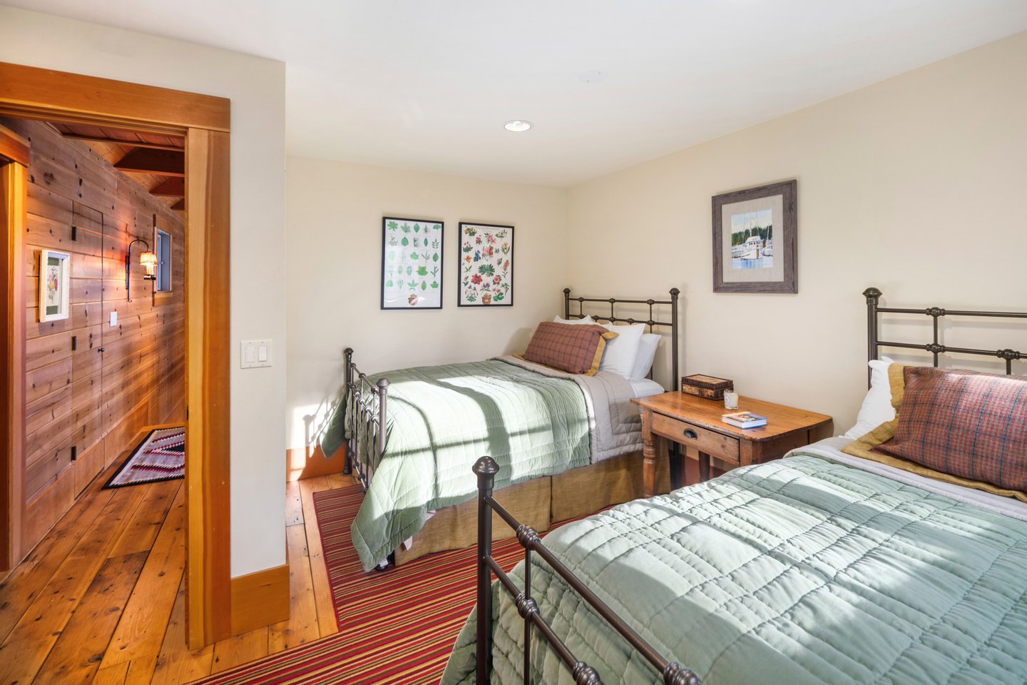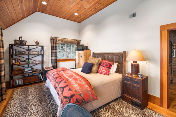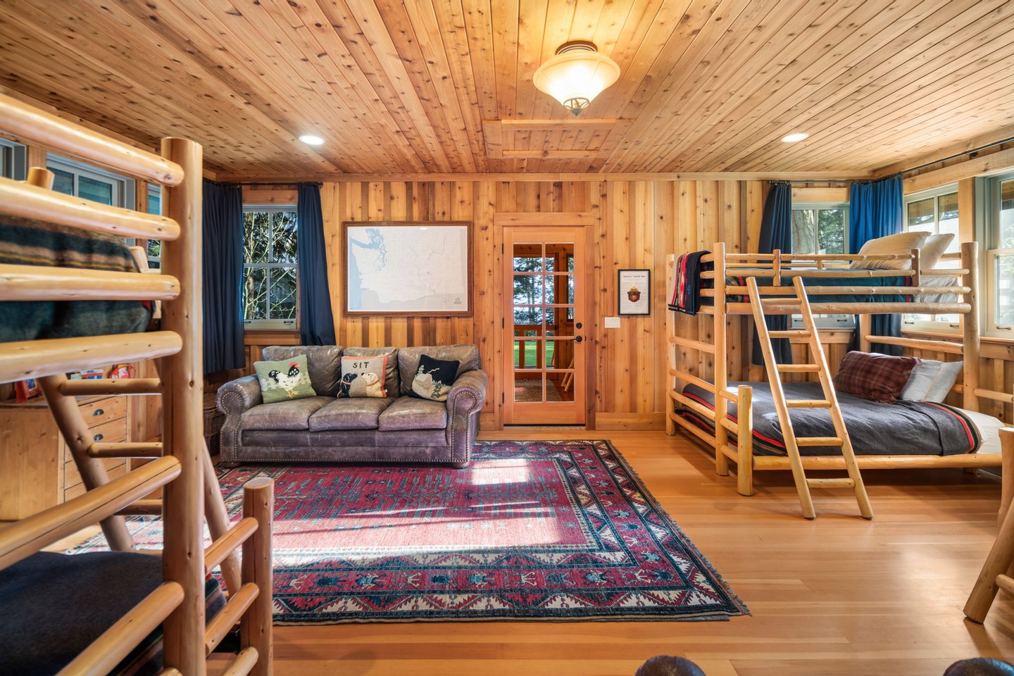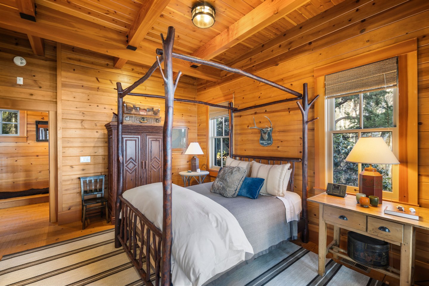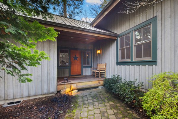 Das 2.590 Quadratfuß große Haus zeichnet sich durch seinen hohen großen Raum mit freiliegenden Douglasienträgern, Nut-und-Feder-Zedernholzvertäfelungen und breiten Tannenboden aus. Ein markanter 30 Fuß hoher Kamin aus Flussfelsen verankert den Raum, während weitläufige holzbezogene Fenster einen weiten Blick auf das Wasser nach Südosten einrahmen.
