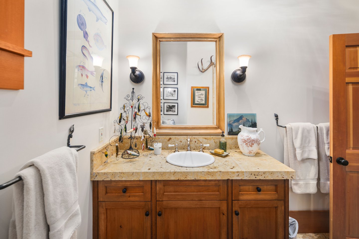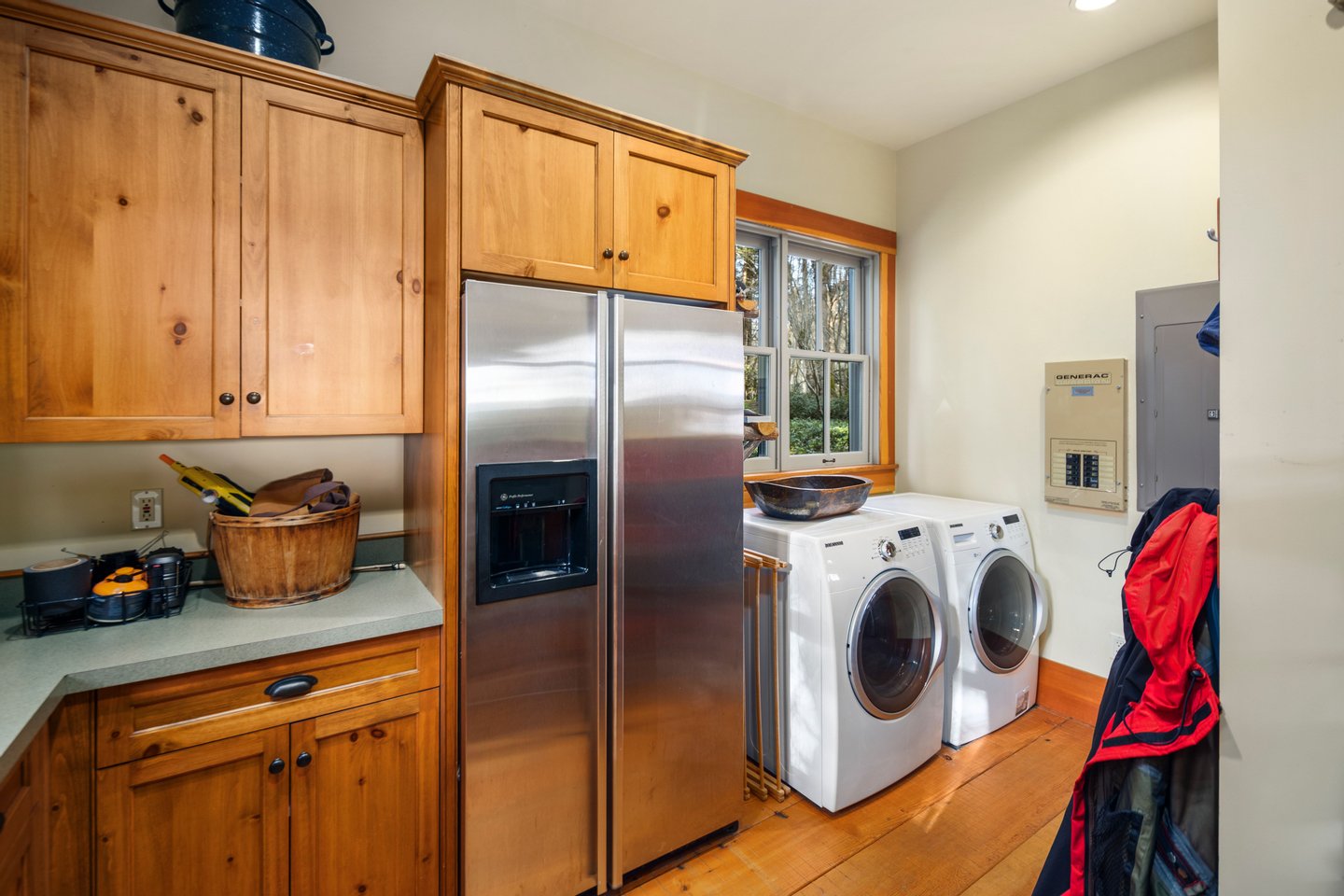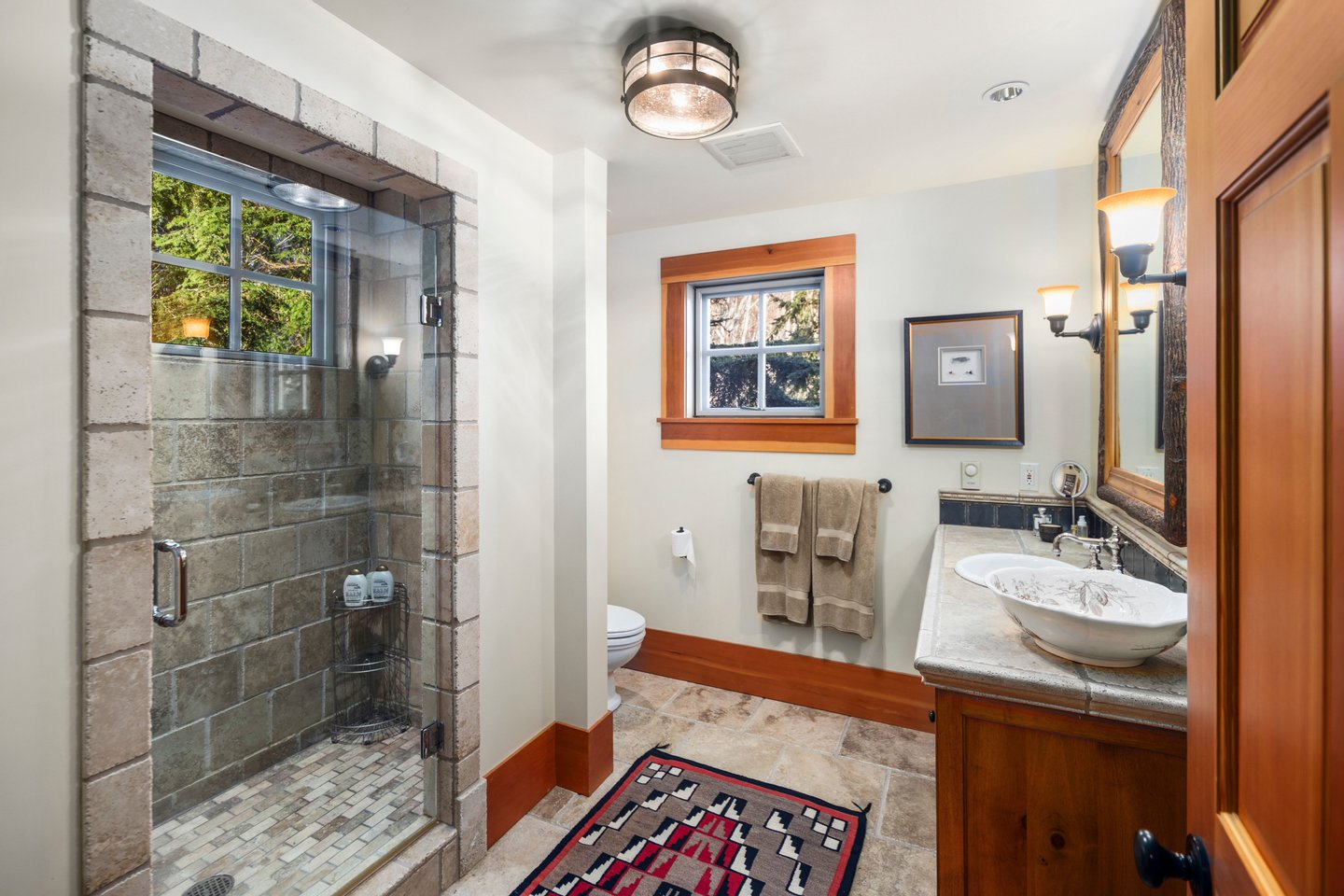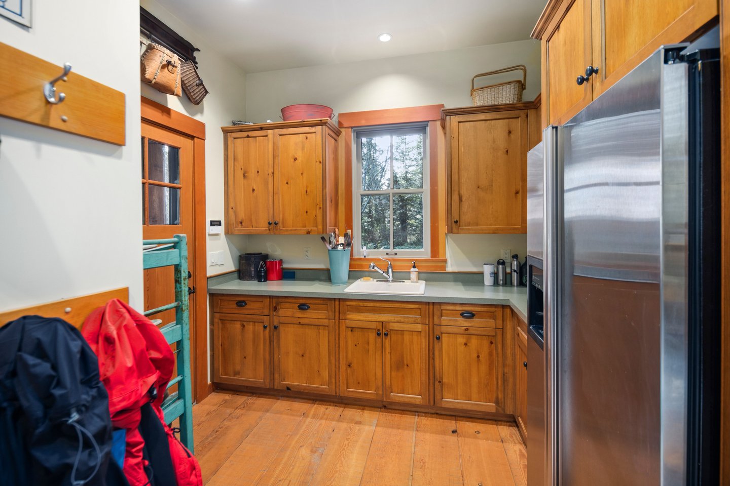 Das 2.590 Quadratfuß große Haus zeichnet sich durch seinen hohen großen Raum mit freiliegenden Douglasienträgern, Nut-und-Feder-Zedernholzvertäfelungen und breiten Tannenboden aus. Ein markanter 30 Fuß hoher Kamin aus Flussfelsen verankert den Raum, während weitläufige holzbezogene Fenster einen weiten Blick auf das Wasser nach Südosten einrahmen.