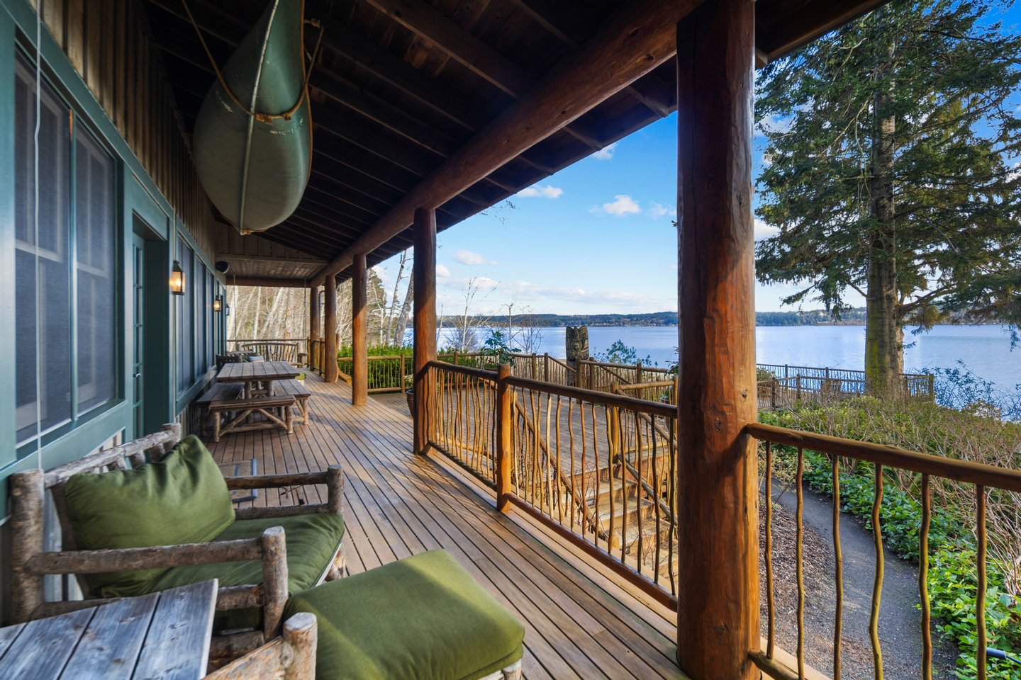 An den ruhigen Ufern des Hood Canal gelegen, bietet dieses außergewöhnliche Uferretreat über 5 Hektar Privatsphäre und 464 Fuß Uferlinie mit Gezeiten. Als klassische Nordwest-"Hütte im Wald" entworfen, verbindet das Haus zeitlose Handwerkskunst mit