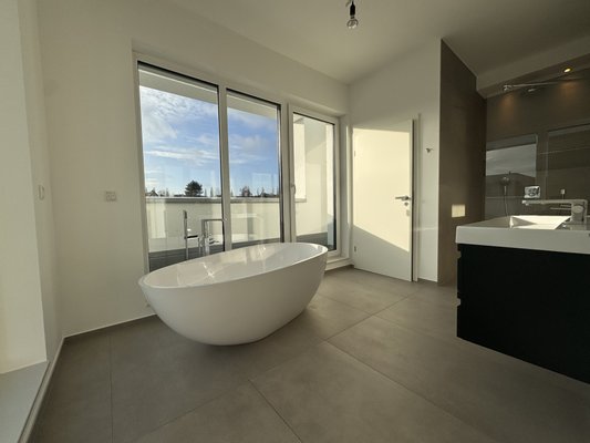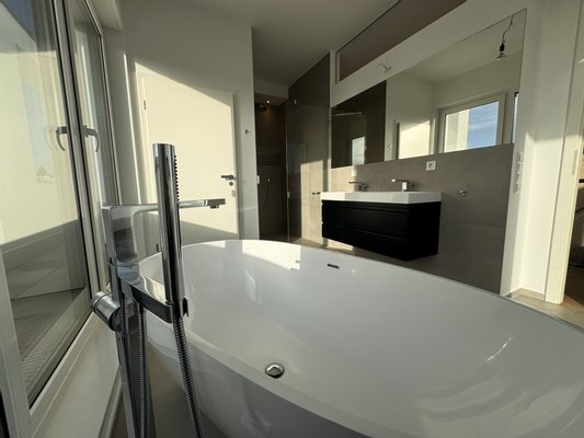 - Tageslicht-Bad mit Doppelwaschtisch, ebenerdiger Dusche, freistehender Badewanne und separat abgetrennten WC