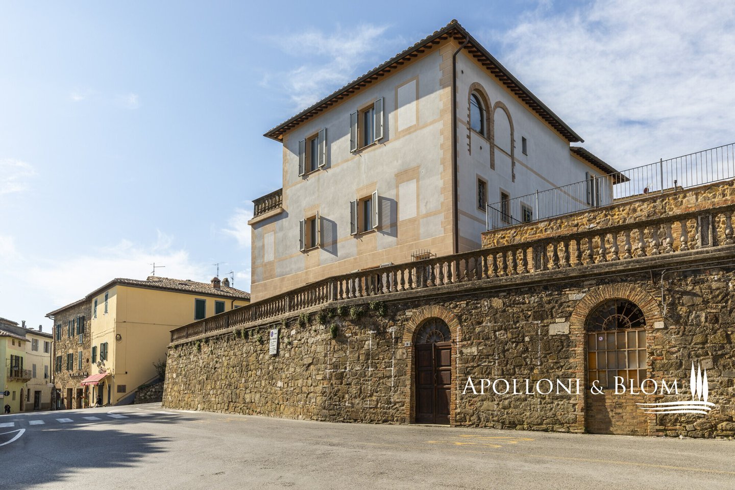 Eleganter und einzigartiger, renovierter Palazzo mit Innenhof auf vier Seiten, Terrassen, spektakulärer Aussicht und Garage im Zentrum von Montalcino zu verkaufen. Die südlich von Siena gelegene Stadt Montalcino ist ein bezauberndes, fast märchenhaftes mittelalterliches Dorf, das von mächtigen Mauern umgeben ist und von einer antiken Burg von authentischer architektonischer Perfektion aus dem Jahr 1361 beherrscht wird. Im Herzen des historischen Zentrums, mit Blick auf einen der wichtigsten Plätze der Stadt, befindet sich dieser Palast aus dem 16. Jahrhundert, eine Residenz mit 640 Quadratmetern auf drei Etagen und einer Garage im Untergeschoss. Ursprünglich ein Kloster, präsentiert es eine klassische viereckige Struktur mit eleganten Fassaden aus weißem und ziegelfarbenem Putz, umgeben von einem Innenhof auf vier Seiten, der große Wohnräume im Freien bietet, die im Stadtzentrum einzigartig sind. Die Innenräume wurden unter Beibehaltung der ursprünglichen Backsteinbögen, Holzbalkendecken und Steinmauern renoviert, in perfekter Harmonie mit Parkettböden in allen Zimmern. Im zweiten Stock befindet sich eine nach Süden ausgerichtete Terrasse, die von einer Travertinbalustrade begrenzt wird. Der Blick reicht bis zu den Bergen von Amiata und Cetona. An klaren Tagen kann man von den nach Nordwesten ausgerichteten Zimmern auch die Skyline der Stadt Siena am Horizont sehen. Jede Etage verfügt über helle Räume, die je nach den persönlichen Bedürfnissen aufgeteilt werden können, mit dem Potenzial für 5 oder 7 Schlafzimmer. Nach der Renovierung im Jahr 2006 wurden das Erdgeschoss und ein Teil des ersten Stocks eine Zeit lang als Büros genutzt. Alle Räume wurden vor kurzem geräumt und neu gestrichen und können nun dekoriert und eingerichtet werden. Die Installationen sind neu und umfassen ein Gebläsekonvektor-System mit Klimaanlage. Obwohl es sich in seinem jetzigen Zustand um ein Einfamilienhaus handelt, kann es leicht in drei unabhängige Einheiten mit jeweils eigenem Zugang aufgeteilt werden. Im Untergeschoss von ca. 260 Quadratmetern befinden sich eine Garage mit vier Stellplätzen sowie Räume für Technik und Lager. Ein idealer Wohnsitz sowohl für die Familie als auch für den Tourismus im Herzen von Montalcino.