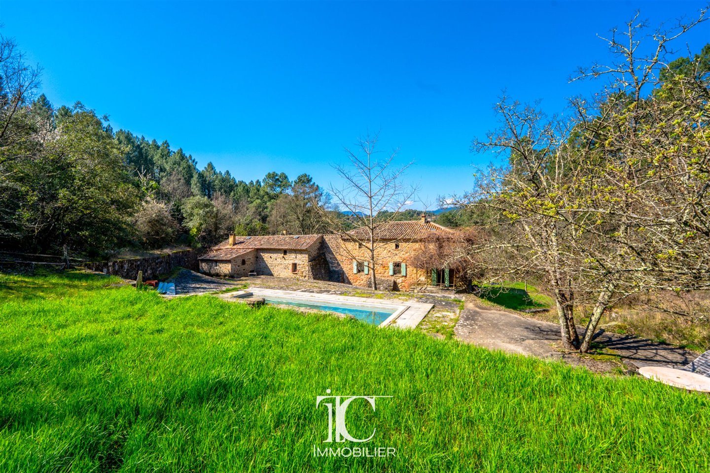 Auf einem bewaldeten Gelände von 10 Hektar ohne jegliche Sichtverbindung erstreckt sich das Hauptgebäude mit ca. 280 m² Wohnfläche, verteilt wie folgt: