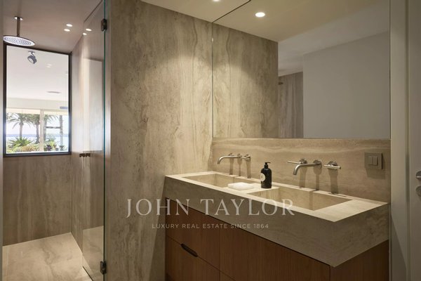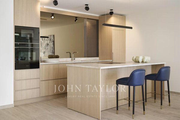 Die Wohnung wurde vollständig renoviert, mit hochwertigen Ausstattungen und einer raffinierten, zeitgenössischen Einrichtung. Sie umfasst ein großes 54 m² großes Wohnzimmer mit offener Küche, zwei Schlafzimmer mit jeweils eigenem Duschbad und separatem WC en suite sowie viele Einbauschränke.