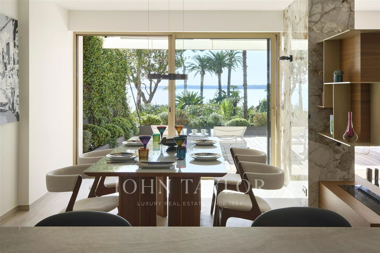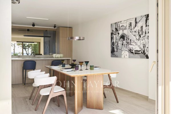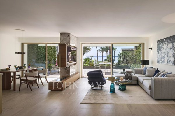Direkt am Meer: Diese prachtvolle 104 m² große Wohnung überzeugt durch eine großzügige, sonnige 46 m² Terrasse mit außergewöhnlichem Blick aufs Meer und die Îles de Lérins.