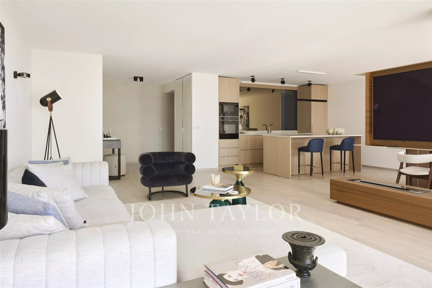 Die Wohnung wurde vollständig renoviert, mit hochwertigen Ausstattungen und einer raffinierten, zeitgenössischen Einrichtung. Sie umfasst ein großes 54 m² großes Wohnzimmer mit offener Küche, zwei Schlafzimmer mit jeweils eigenem Duschbad und separatem WC en suite sowie viele Einbauschränke.