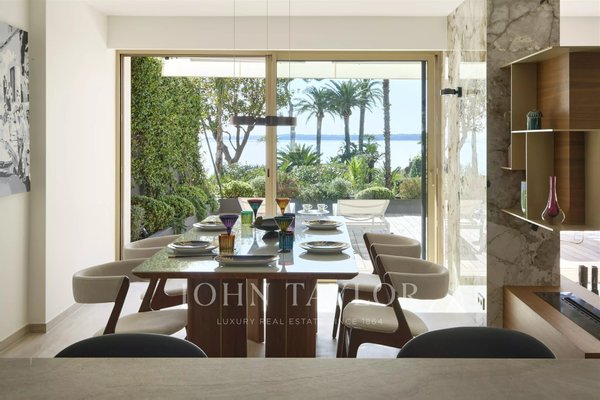 Direkt am Meer: Diese prachtvolle 104 m² große Wohnung überzeugt durch eine großzügige, sonnige 46 m² Terrasse mit außergewöhnlichem Blick aufs Meer und die Îles de Lérins.