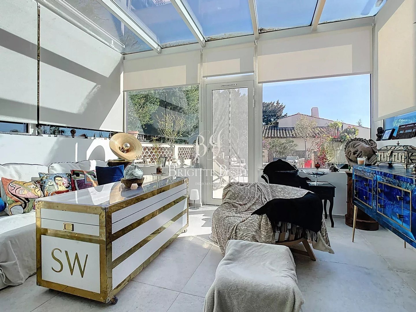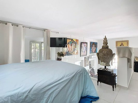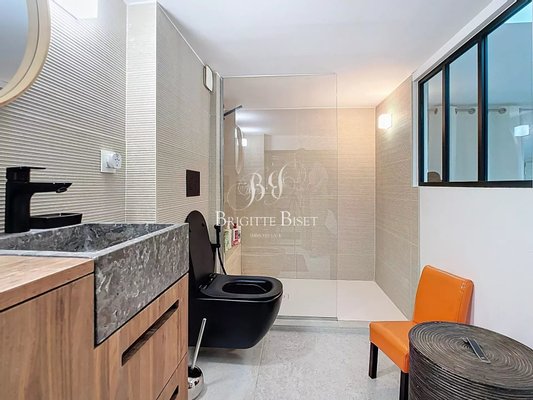 Die Agentur Brigitte Biset bietet Ihnen in Co-Exklusivität eine 84 m² Wohnfläche umfassende Maisonette-Wohnung in Erdgeschosshöhe, 48,89 m² „loi Carrez“, bestehend aus einem Eingangsbereich, Wohnzimmer mit offener, komplett ausgestatteter Küche, einer wunderschönen, geschlossenen Pergola von 15 m² mit Zugang zu einer schönen Terrasse von 33 m², Ostlage und wunderschöner Meerblick, einem Schlafzimmer im Erdgeschoss en Suite mit Bad und einem Gäste-WC. Im Obergeschoss ein Elternsuite mit Kleiderschränken und Bad/Dusche/WC.