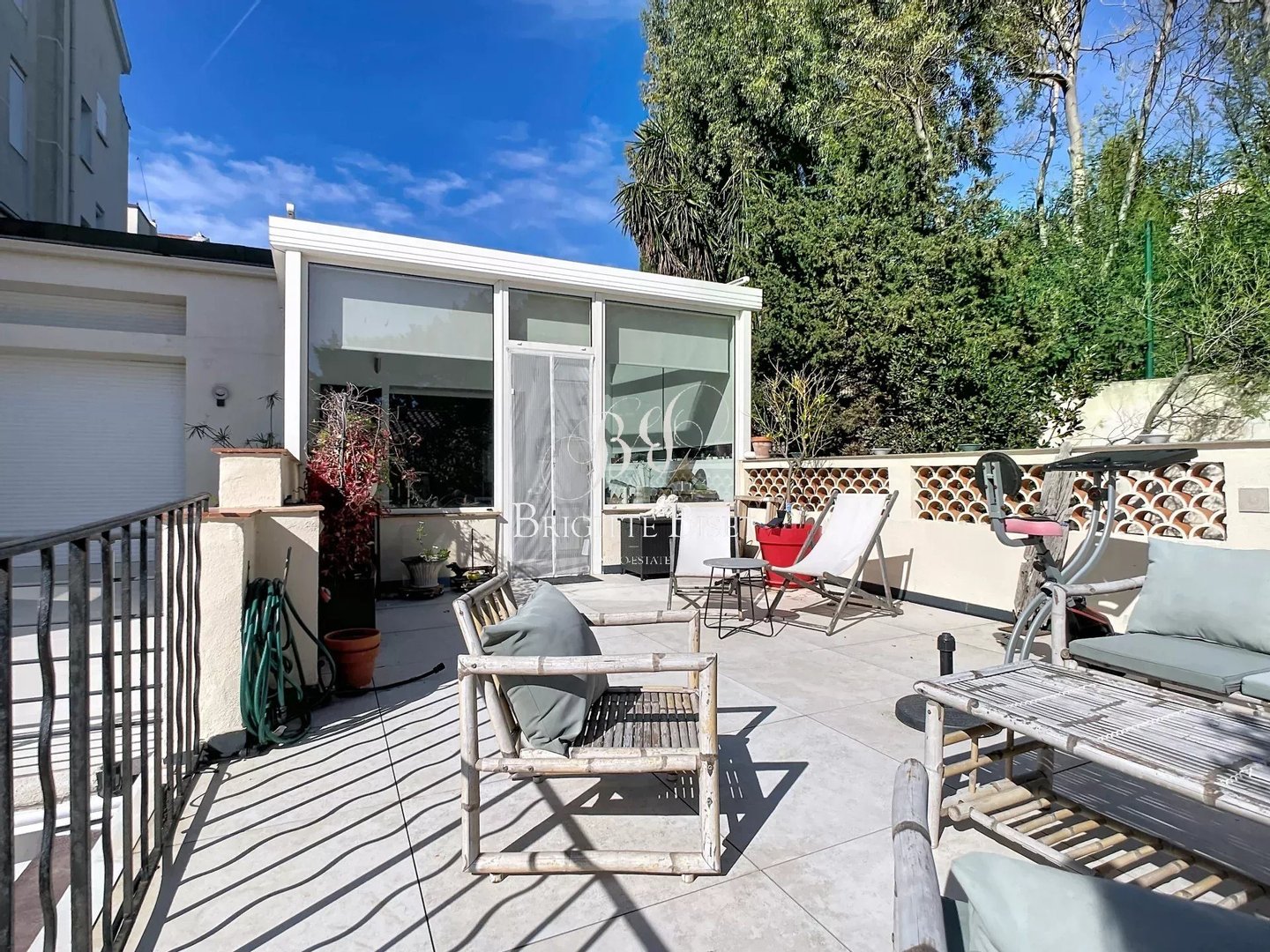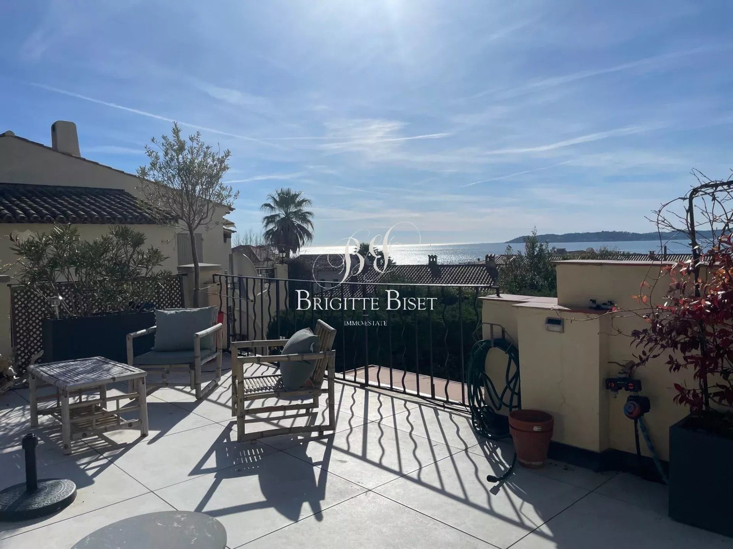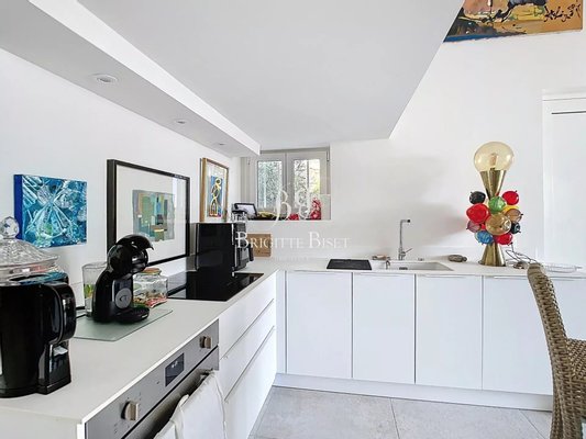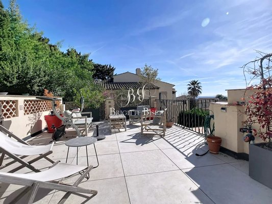 Die Agentur Brigitte Biset bietet Ihnen in Co-Exklusivität eine 84 m² Wohnfläche umfassende Maisonette-Wohnung in Erdgeschosshöhe, 48,89 m² „loi Carrez“, bestehend aus einem Eingangsbereich, Wohnzimmer mit offener, komplett ausgestatteter Küche, einer wunderschönen, geschlossenen Pergola von 15 m² mit Zugang zu einer schönen Terrasse von 33 m², Ostlage und wunderschöner Meerblick, einem Schlafzimmer im Erdgeschoss en Suite mit Bad und einem Gäste-WC. Im Obergeschoss ein Elternsuite mit Kleiderschränken und Bad/Dusche/WC.