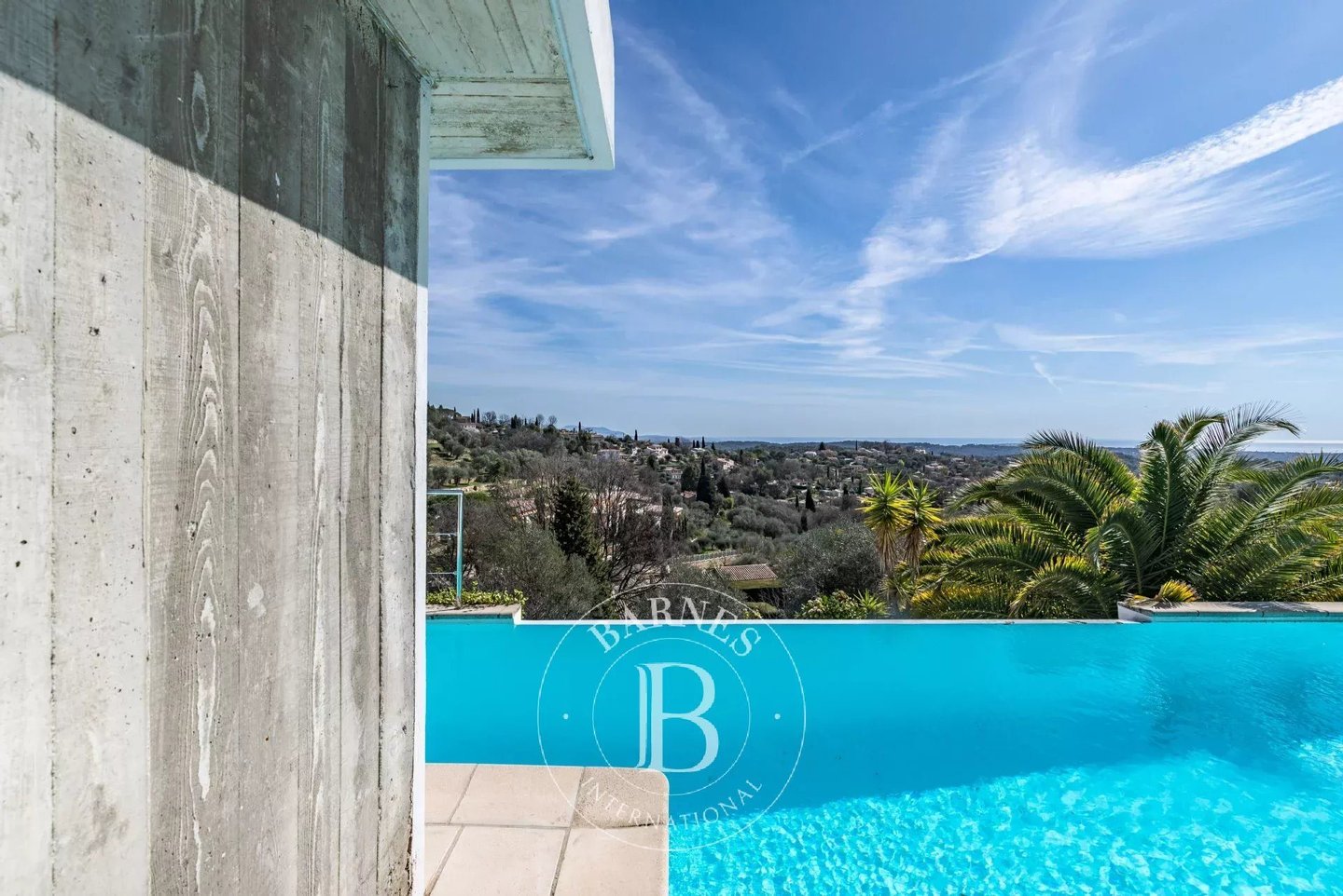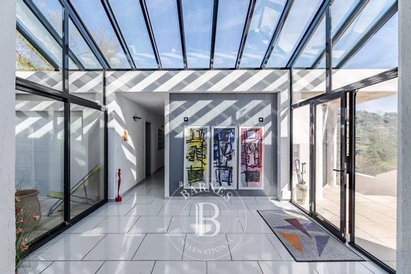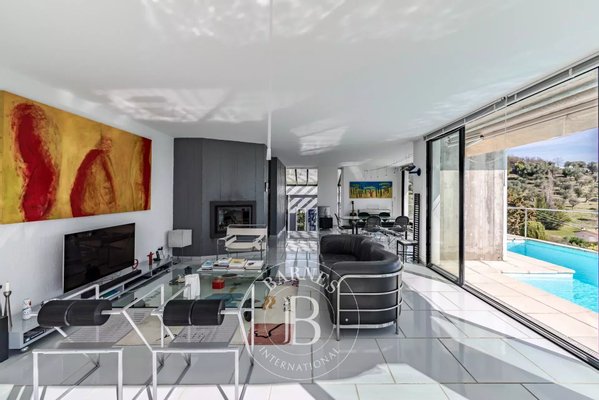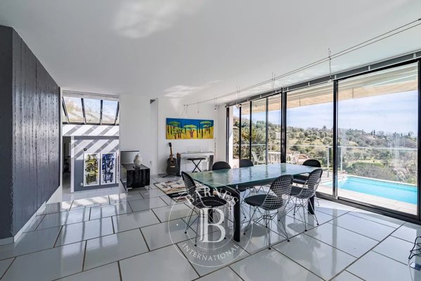 In der Nähe von Opio – Diese Corbusier-Stil-Villa thront auf einem sonnigen Hügel mit ca. 5.000 m² Grundstück in einer absolut ruhigen, uneinsehbaren Umgebung. Die Villa verfügt über eine private Einfahrt, klare Linien aus Beton, Stahl und Glas, und profitiert von viel Tageslicht durch boden-zu-decke Glas- Türen.