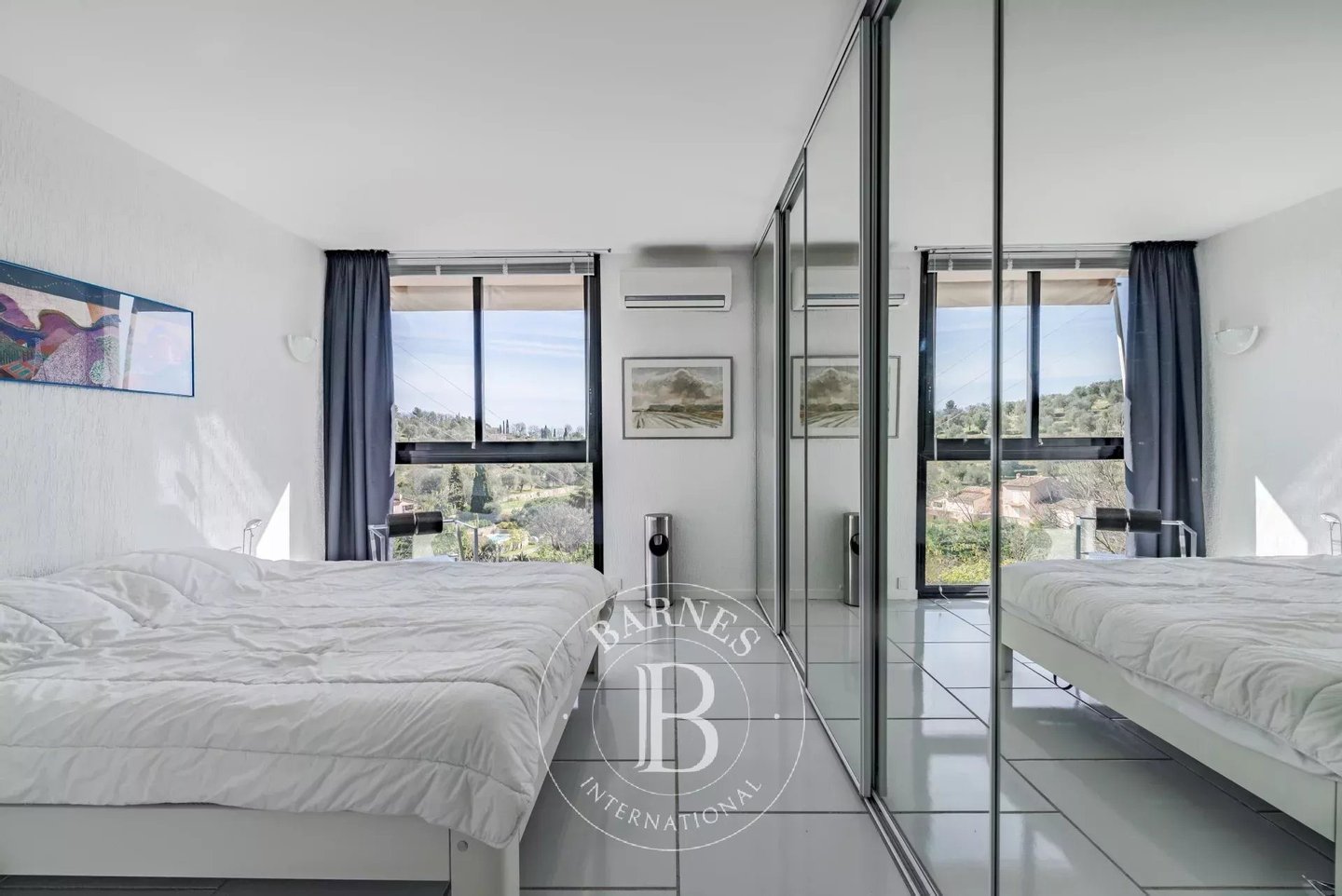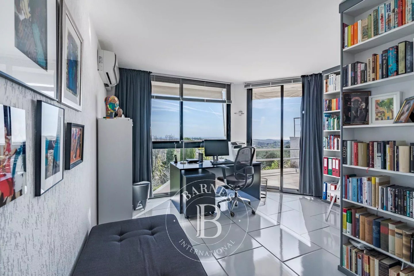 Der Schlafbereich umfasst vier Schlafzimmer, alle mit reversibler Klimaanlage ausgestattet, zwei Badezimmern und drei Toiletten. Das Hauptschlafzimmer wird auch als Büro mit Bibliothek genutzt.