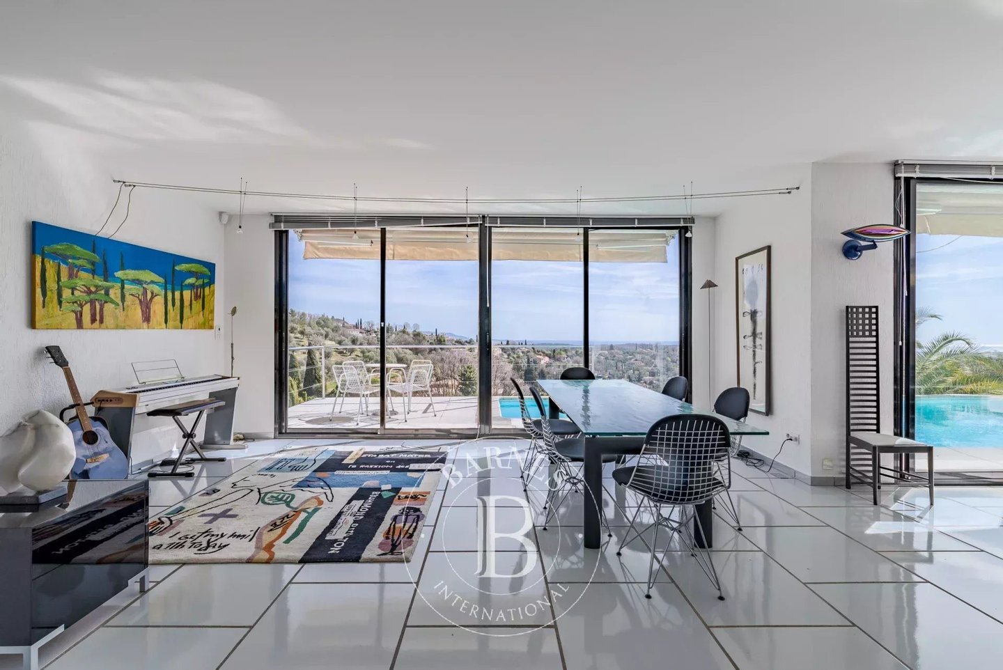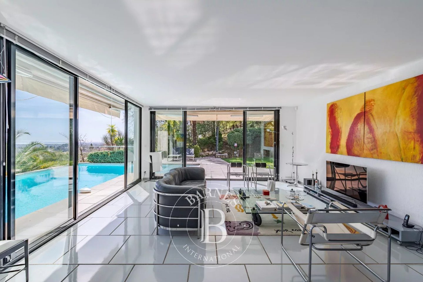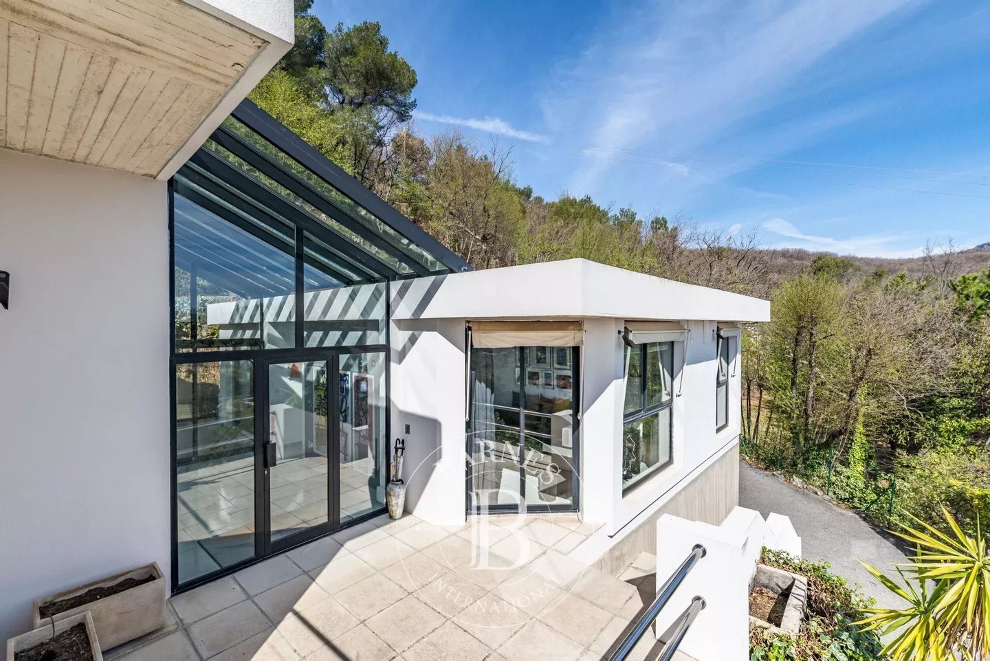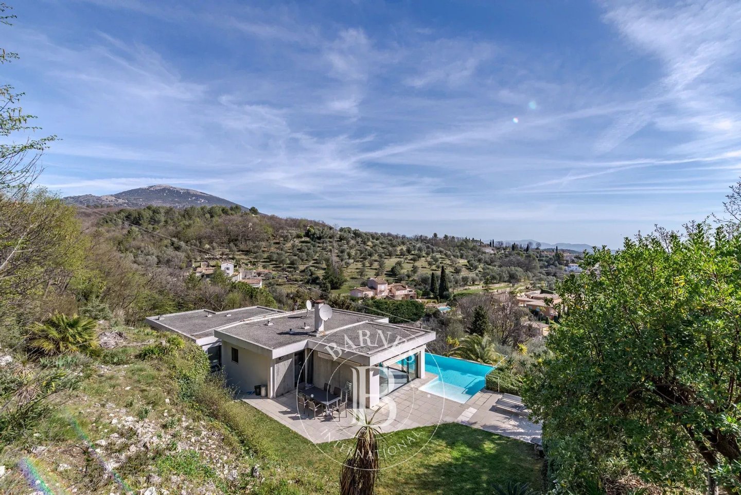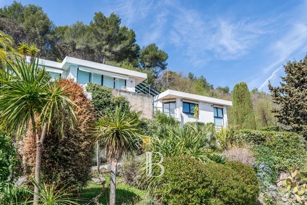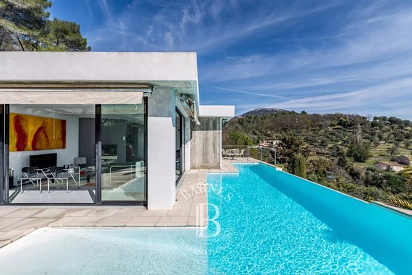 In der Nähe von Opio – Diese Corbusier-Stil-Villa thront auf einem sonnigen Hügel mit ca. 5.000 m² Grundstück in einer absolut ruhigen, uneinsehbaren Umgebung. Die Villa verfügt über eine private Einfahrt, klare Linien aus Beton, Stahl und Glas, und profitiert von viel Tageslicht durch boden-zu-decke Glas- Türen.
