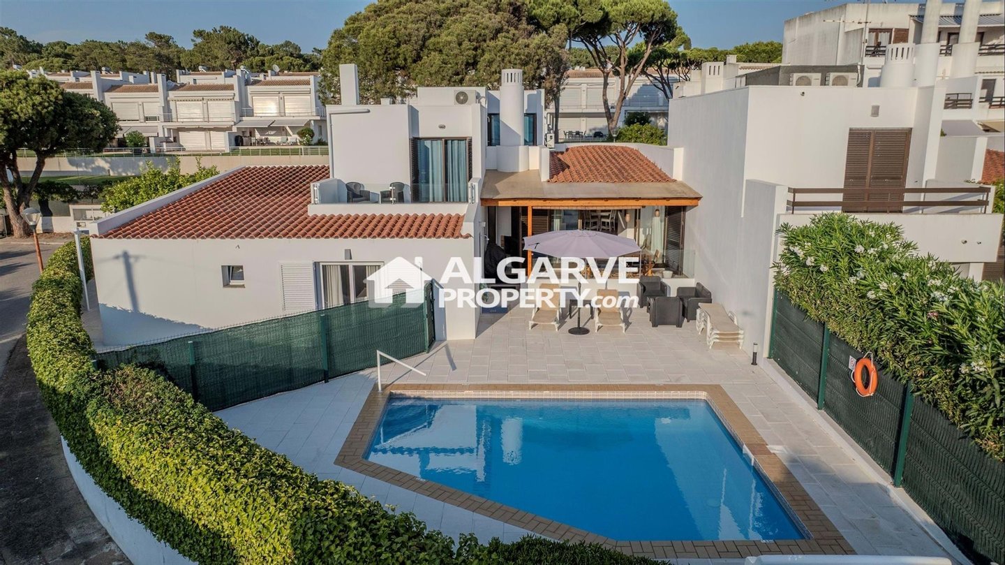 Villa mit Pool und Golfblick in Vilamoura, auf einem Grundstück von 334 m² gelegen, nur 10 Minuten vom Strand und vom Yachthafen entfernt. Ruhige Lage in der Nähe aller Annehmlichkeiten.