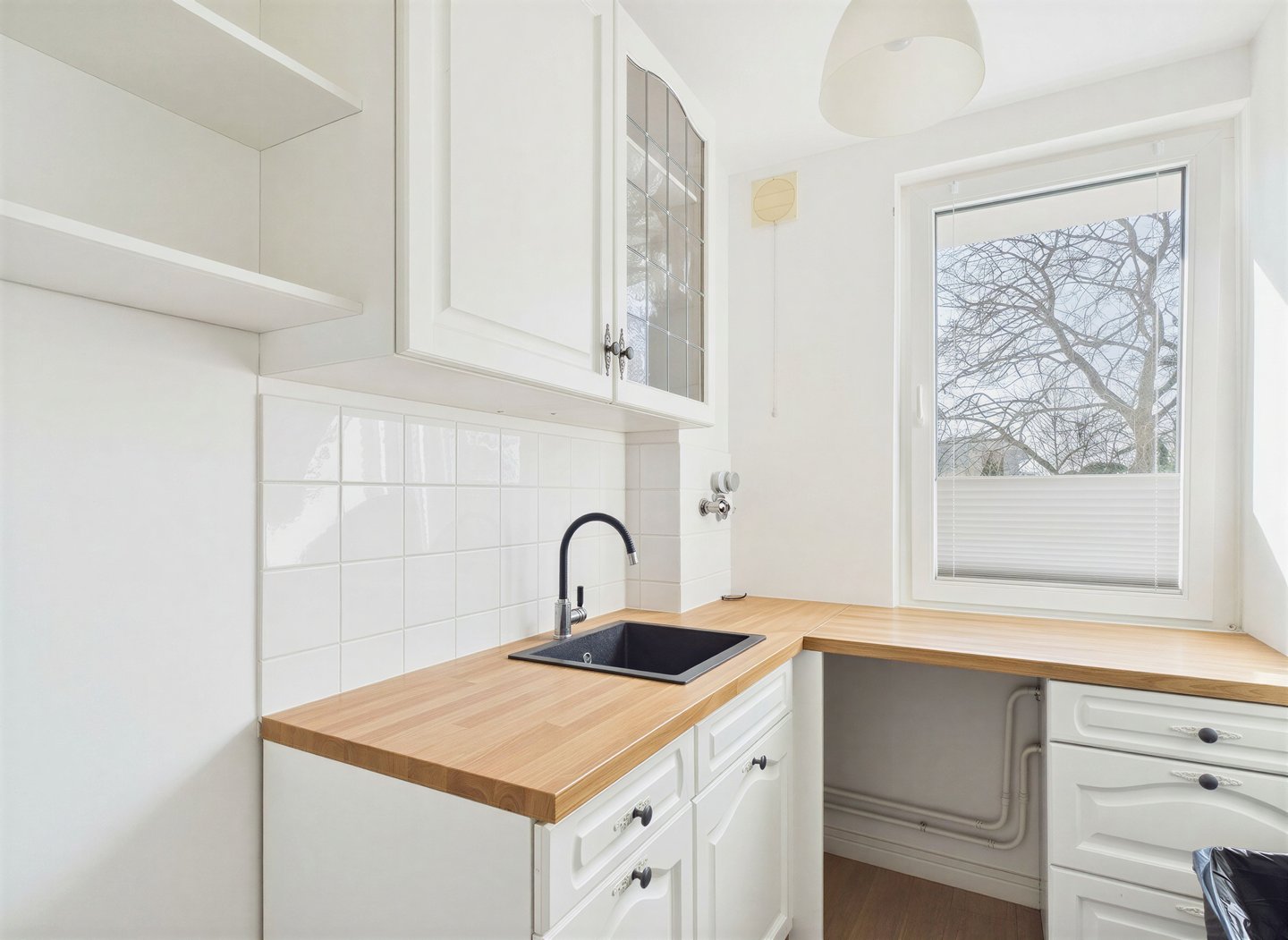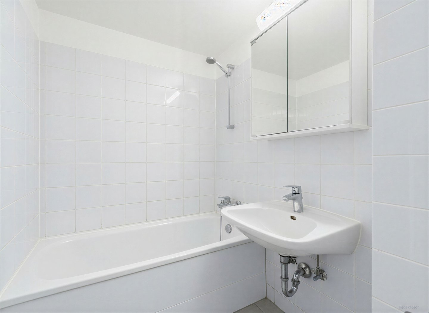 Die Küche ist funktional gestaltet und fügt sich harmonisch in den Grundriss ein. Das Badezimmer verfügt über eine zeitgemäße Ausstattung mit Dusche und modernen Sanitäranlagen.
