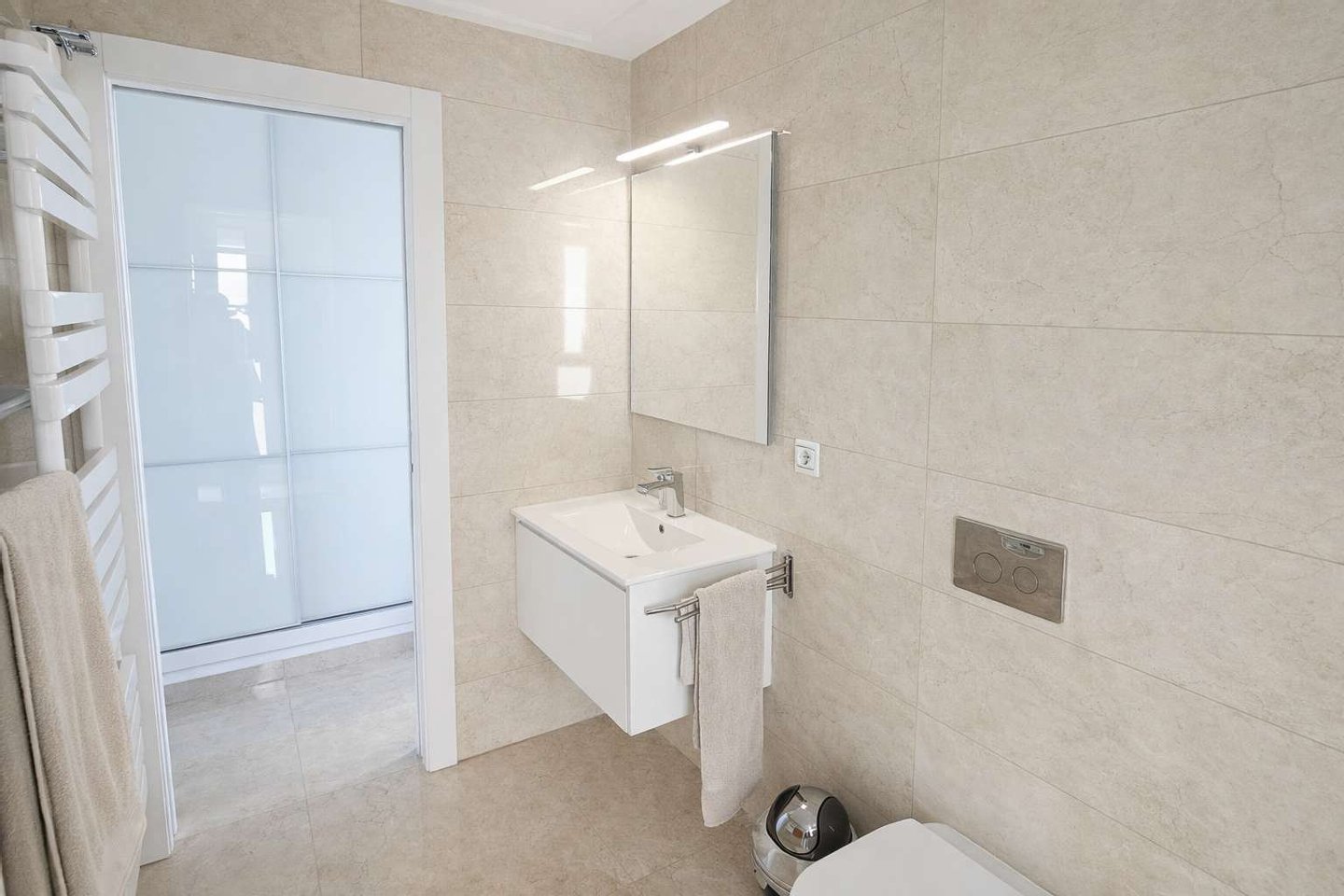 Ebenfalls im Erdgeschoss befindet sich eines der drei großzügigen Schlafzimmer, ausgestattet mit Einbauschränken und eleganten Glasschiebetüren, die auf eine private Seitenterrasse führen - ein idealer Ort, um den Morgenkaffee an der frischen Luft zu genießen. Ein modernes Familienbadezimmer mit einer eleganten begehbaren Dusche und minimalistischem Dekor befindet sich in unmittelbarer Nähe. Im Eingangsbereich befindet sich zudem ein unauffälliger Schrank, der als zentraler Knotenpunkt für die Elektroinstallation der Immobilie dient, die erst im vergangenen Jahr modernisiert wurde und somit zusätzliche Sicherheit bietet.