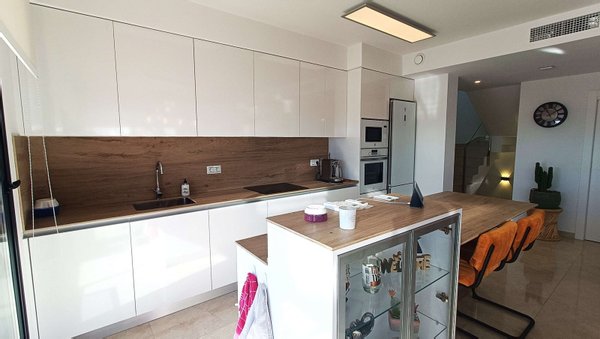 Beim Betreten der Villa werden Sie von einem hellen und großzügigen, offen gestalteten Wohn- und Essbereich empfangen, der nahtlos in eine voll ausgestattete, moderne Küche übergeht. Raumhohe Fenster durchfluten den Raum mit Tageslicht und schaffen ein wunderbares Gefühl von Weite, während sie gleichzeitig den herrlichen Blick auf die Terrasse und die umliegende Landschaft einrahmen. Die makellose Küche verfügt über eine stilvolle Frühstückstheke, die sowohl zusätzlichen Stauraum als auch einen praktischen Ort für geselliges Beisammensein bietet - ideal für zwanglose Mahlzeiten oder zum Empfang von Gästen.
