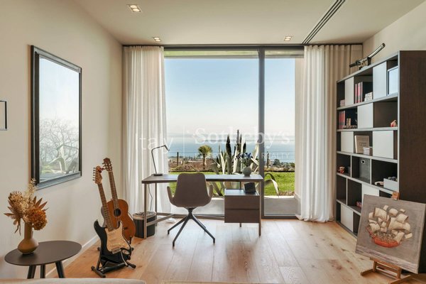 The lower level offers additional living spaces including a study area, a library, two bedrooms with en-suite bathrooms and walk-in wardrobes, as well as an independent guest apartment with its own entrance.