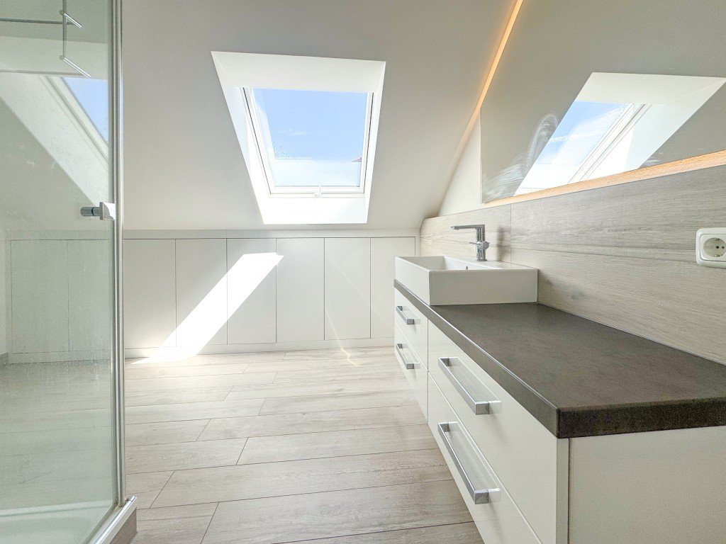 * 2 großzügige Schlafzimmer (ca. 32 und 39 m² Nfl.) mit 1 Duschbad im Dachgeschoss.