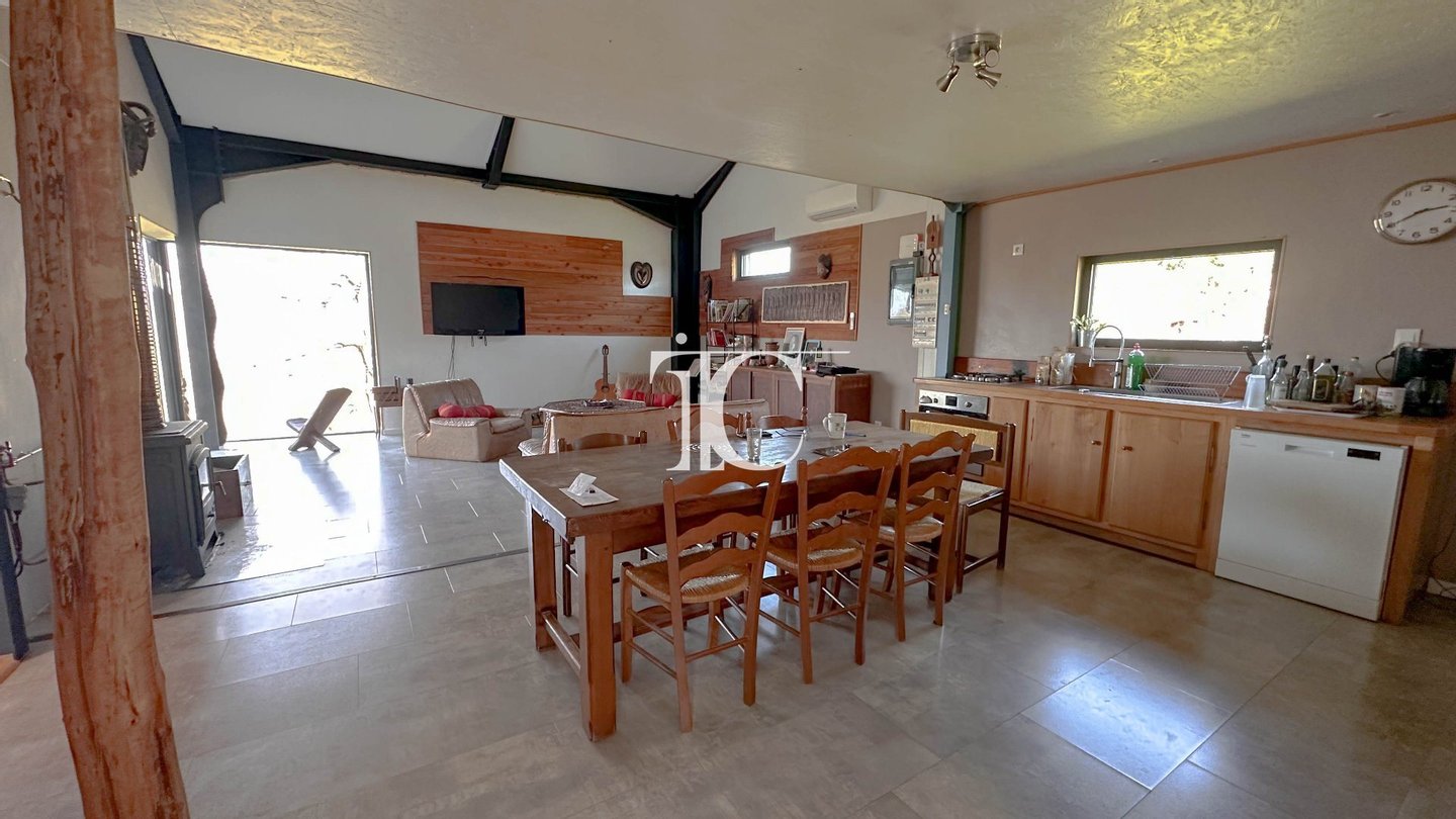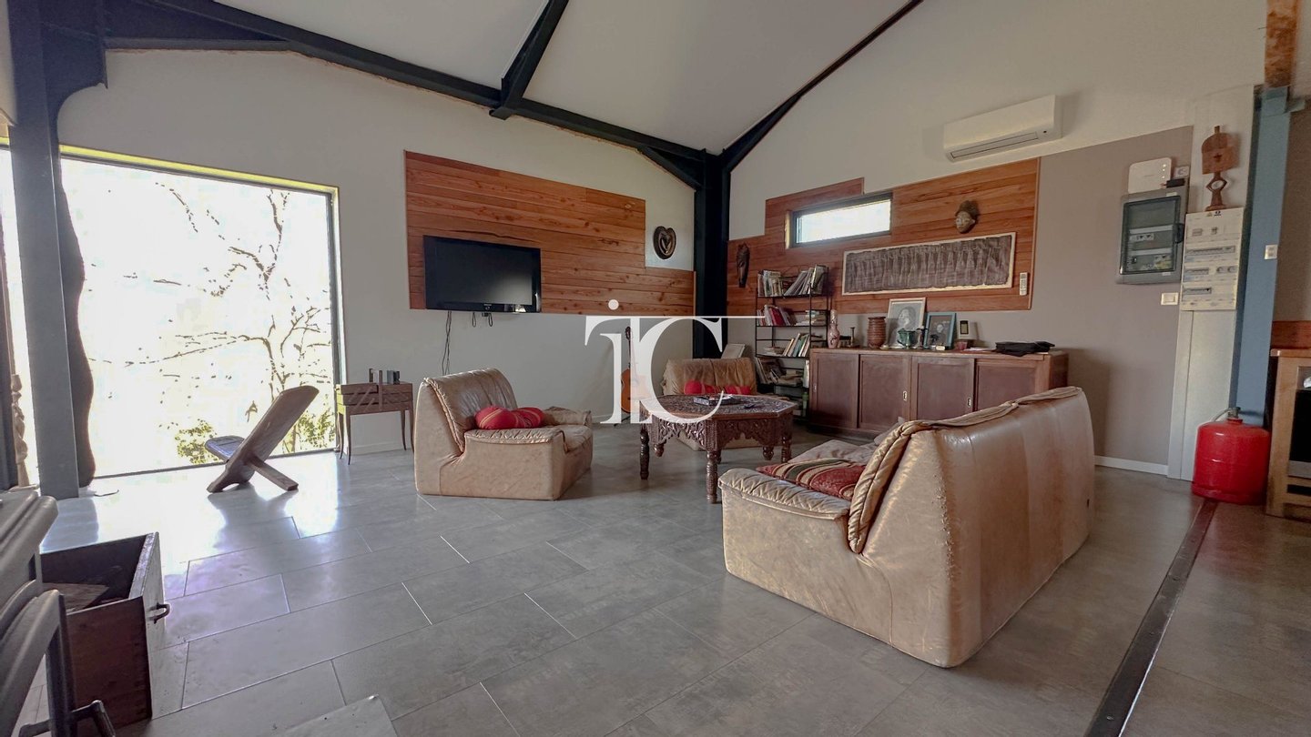 Zum Verkauf steht ein bioklimatisiertes Haus im Herzen des Nationalparks Cevennen, dessen Tragstruktur aus Metall besteht und mit einer Faserverbundhaut verkleidet ist. Dadurch vereinen sich Haltbarkeit, Modernität und eine perfekte Integration in die natürliche Umgebung. Dieses Grundstück bietet ein großes Wohnzimmer mit Kathedralenhöhe, lichtdurchflutet durch großzügige Fensterfronten, und schafft so einen warmen Wohnraum. Es umfasst vier Schlafzimmer, davon eines völlig eigenständig, ideal zum Empfangen von Besuchern oder für eine berufliche Nutzung, sowie zwei Schlafzimmer mit eigenem Bad. Im Obergeschoss überragt eine Mezzanine das Wohnzimmer und führt zu einem großen Spiel- und Sportraum mit vielfältigen Gestaltungsmöglichkeiten. Das bewaldete Grundstück von 3.168 m² ist eine wahre Ruheoase, ergänzt durch ein Erfrischungsbecken, eine Boule-Arena und eine Bohrung, die Wasserautonomie für die Bewässerung ermöglicht. Der gepflegte Garten bietet zahlreiche Entspannungsbereiche und eine friedliche Atmosphäre zu allen Jahreszeiten. Das Haus verfügt außerdem über eine große Garage. Was Ausstattung betrifft, profitiert die Immobilie von Solarzellen zur Eigennutzung mit Einspeisung von überschüssigem Strom, elektrisch betriebenen Rollläden, einer Holzheizung und einer reversiblen Klimaanlage, die ganzjährig optimalen Komfort gewährleistet. Das Ensemble bildet eine moderne, wirtschaftliche und umweltfreundliche Wohnlösung, die sich perfekt an alle richtet, die einen natürlichen, komfortablen und leistungsfähigen Lebensraum suchen.