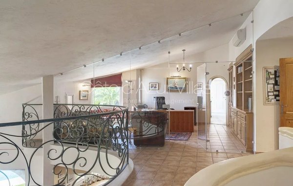 1. Obergeschoss: Eine prächtige Elternsuite mit Panoramablick aufs Meer und die Hügel, mit Bad, Dusche, Ankleidezimmer und eigenem WC. Ein großzügiges Büro im Mezzanin bietet einen inspirierenden Arbeitsbereich mit Blick auf die Gärten, den Pool und das Meer. Ein zweites Schlafzimmer mit Bad vervollständigt diese Ebene.
