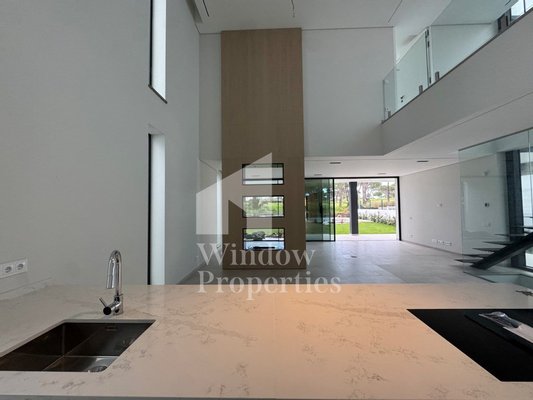 Auf zwei Etagen und einem Keller verteilt, wurde das Haus bis ins Detail durchdacht. Im Erdgeschoss empfängt ein imposanter Eingangshalle mit doppelter Deckenhöhe und einlau azar eine Gästetoilette, zwei elegante Suiten und eine moderne, vollständig ausgestattete Küche mit Miele-Geräten in Open-Space-Konzept zu Ess- und Wohnbereich. Dieser Bereich geht nahtlos nach außen über, wo der Garten und der Pool in die Golf-Landschaft eingebettet sind und eine einzigartige Kulisse für Freizeit und Gemeinschaft schaffen.