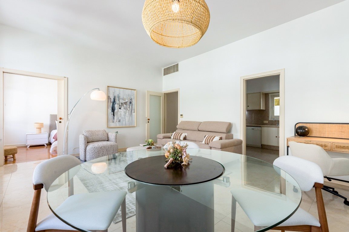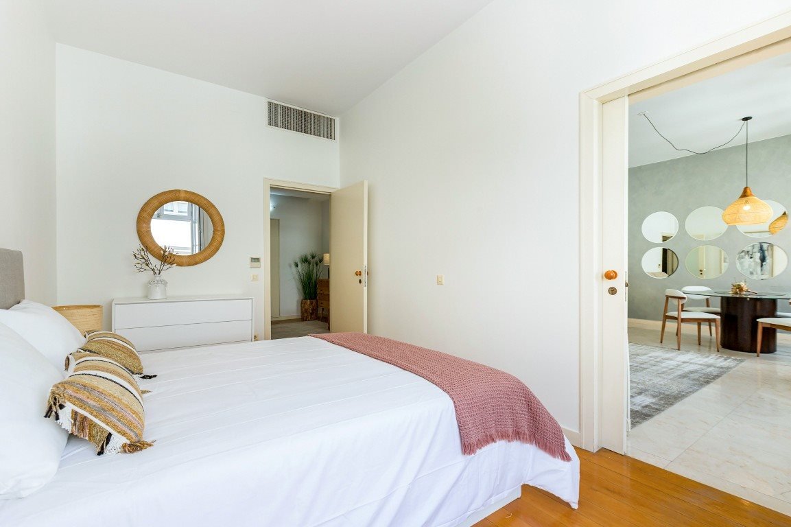 Die Wohnung verfügt über ein geräumiges Schlafzimmer, ein helles und luftiges Wohnzimmer, ein komplettes Badezimmer und eine große Küche mit Waschraum und Speisekammer. Sowohl Wohnzimmer als auch Schlafzimmer profitieren von großen Fenstern, die die Innenräume mit Tageslicht durchfluten. Die Wohnung befindet sich im vierten Stock und genießt ausgezeichnete Sonneneinstrahlung sowie eine ruhige Atmosphäre.