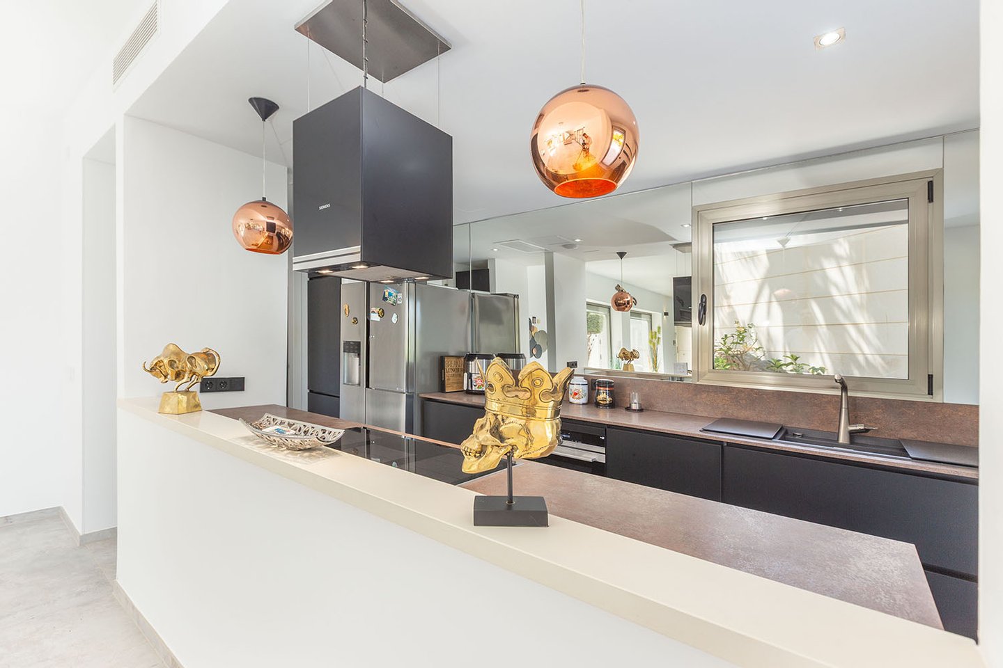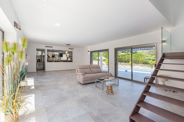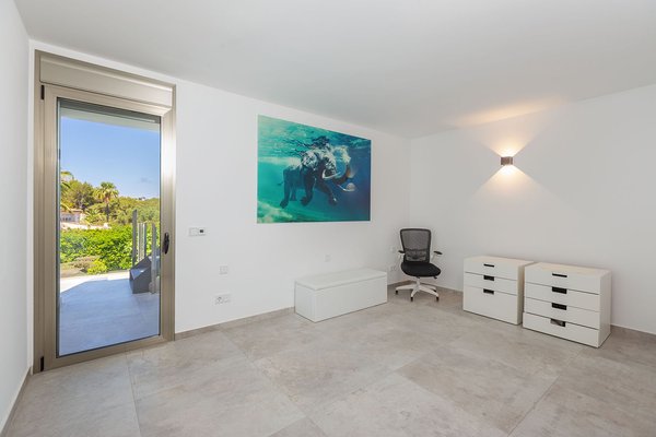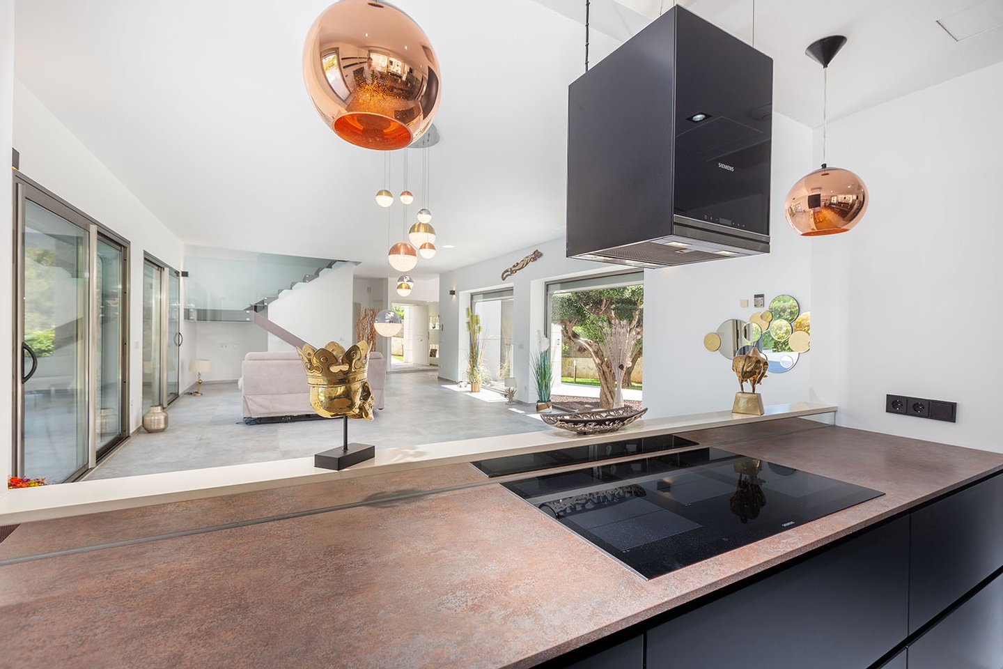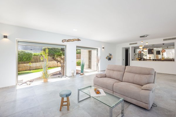 Die lichtdurchflutete Villa überzeugt durch eine erstklassige Bauweise und ein elegantes, hochwertiges Interieur. Der offen gestaltete Wohnbereich schafft ein großzügiges Raumgefühl und wurde mit Blick auf modernes Design sowie technische Raffinesse konzipiert. Fließende Übergänge führen auf die weitläufige, teilweise überdachte Terrasse mit Salzwasserpool und unterstreichen das mediterrane Wohnambiente.