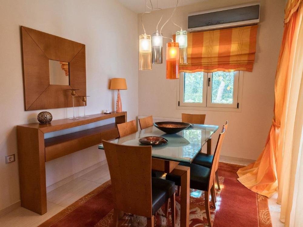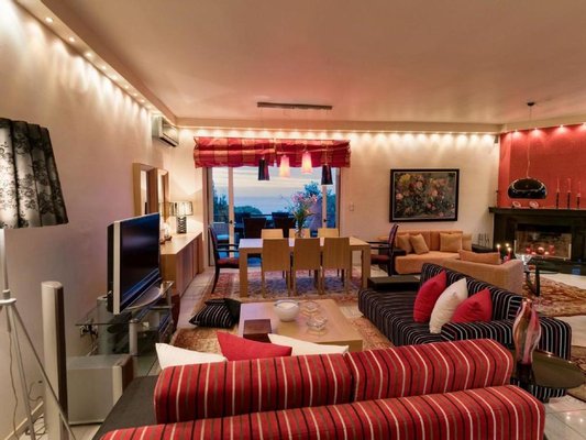 Die Villa erstreckt sich über zwei Etagen, die durch eine Innentreppe verbunden sind. Sie umfasst einen großen, offenen Wohn-/Essbereich mit offener Küche und Kamin sowie vier Schlafzimmer mit jeweils eigenem Bad. Vom Balkon im ersten Stock genießt man einen atemberaubenden Panoramablick auf die Umgebung und das Meer.