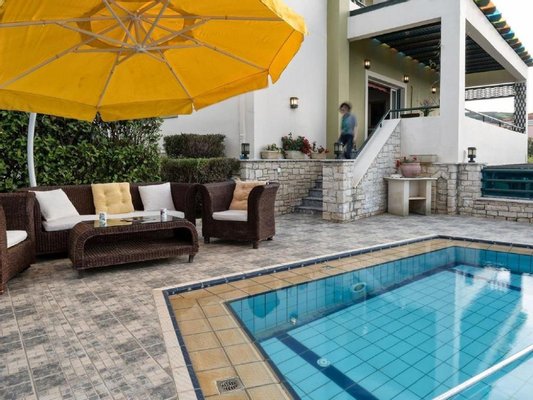 Einzigartige Villa mit separatem Apartment auf einem großzügigen Grundstück in Rousospiti, Rethymno, zu verkaufen. Die zweistöckige Villa und das Apartment verfügen jeweils über einen eigenen Eingang auf einem 2.627,34 m² großen Grundstück. Das Apartment befindet sich im Erdgeschoss und besteht aus einem großen, offenen Wohn-/Essbereich mit offener Küche und Kamin sowie zwei Schlafzimmern mit jeweils eigenem Bad. Zur