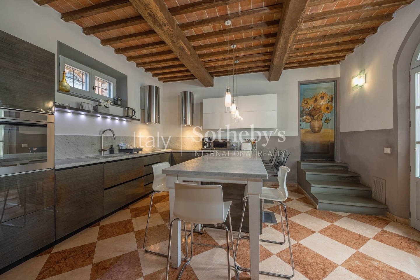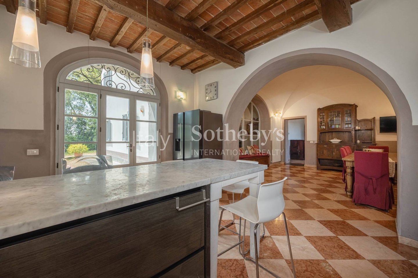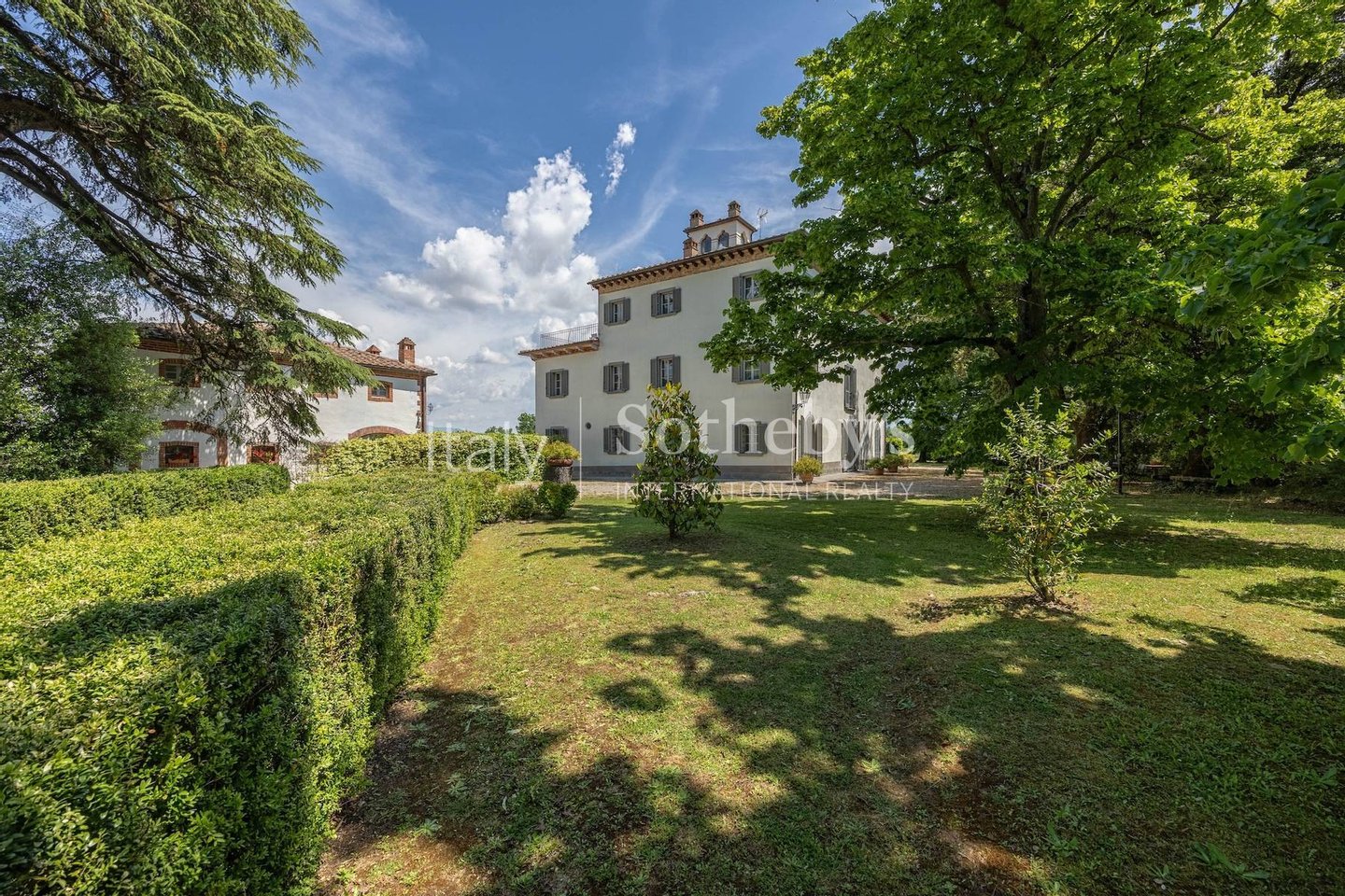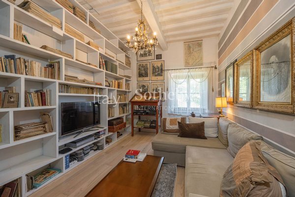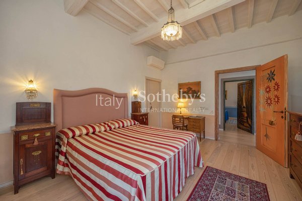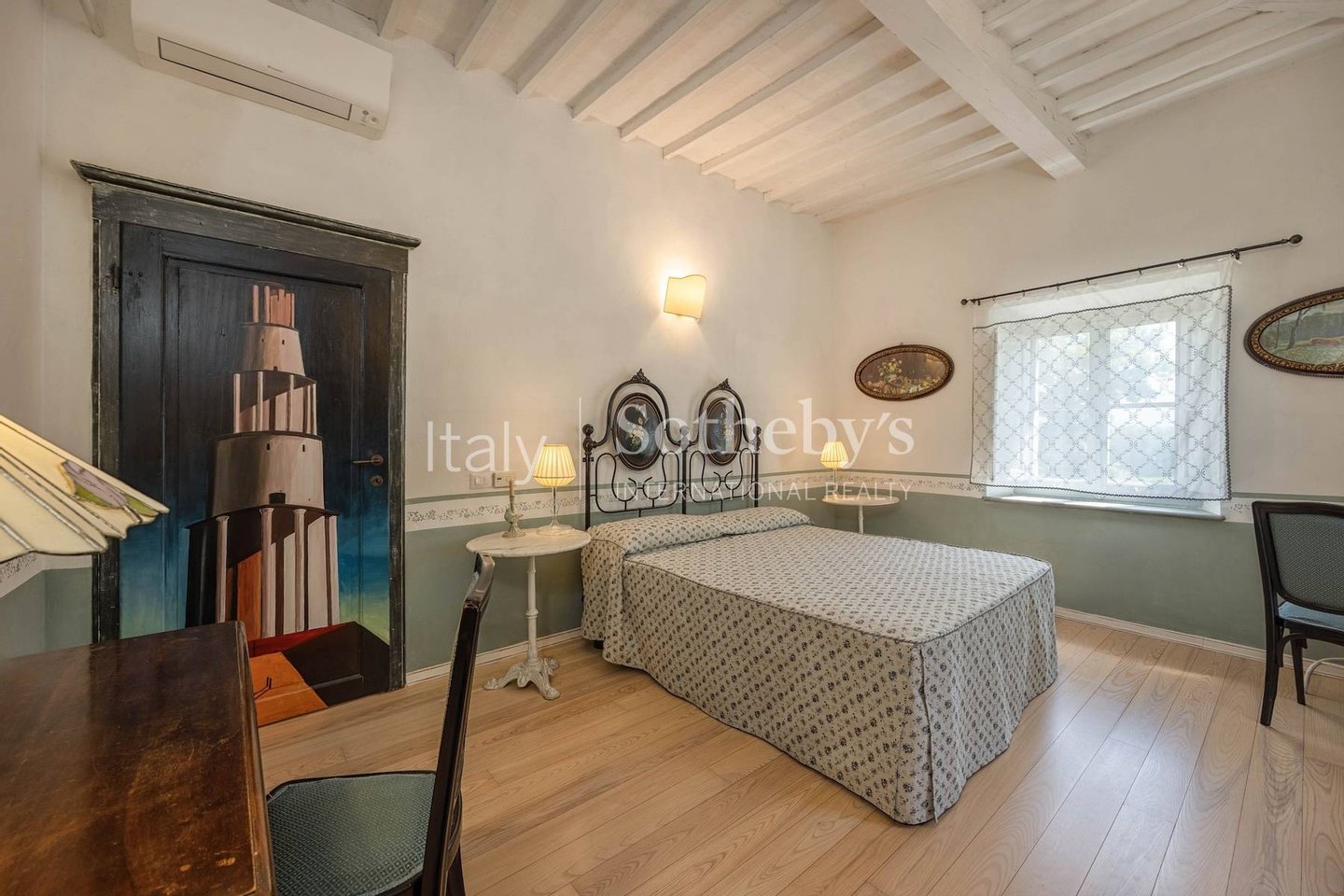 The main villa, measuring approximately 800 sqm, is arranged over several levels and retains original features such as wooden beams, terracotta floors, and period fireplaces. The interiors include a main reception room, dining room, Carrara marble kitchen, panoramic terrace, and a rooftop belvedere. The sleeping area offers 12 bedrooms and 7 bathrooms, along with additional spaces including a wardrobe room, cellar, laundry room, and a traditional wood-fired oven. The two annexes, each of approximately 200 sqm, provide further possibilities: one houses the caretaker's accommodation with living room, kitchen, two bedrooms, and a bathroom; the other is divided into two independent apartments of about 100 sqm each.