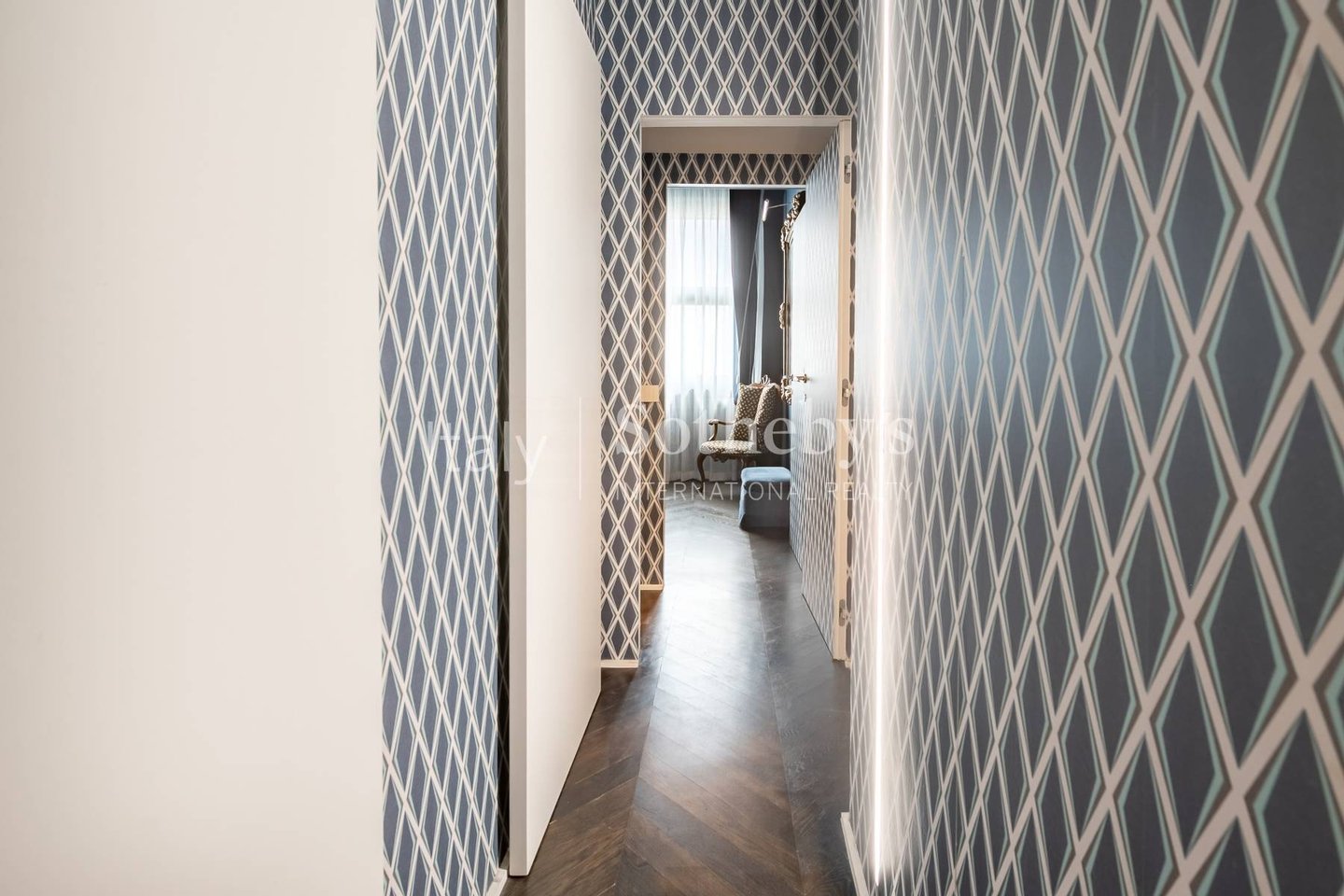 The sleeping area includes a master bedroom with en suite bathroom, a large walk-in wardrobe, and a study; as well as a second bedroom with its own bathroom. The property has been completely renovated and is distinguished by a refined yet luxurious aesthetic, designer furnishings, dramatic lighting, bespoke details, and high-quality materials.