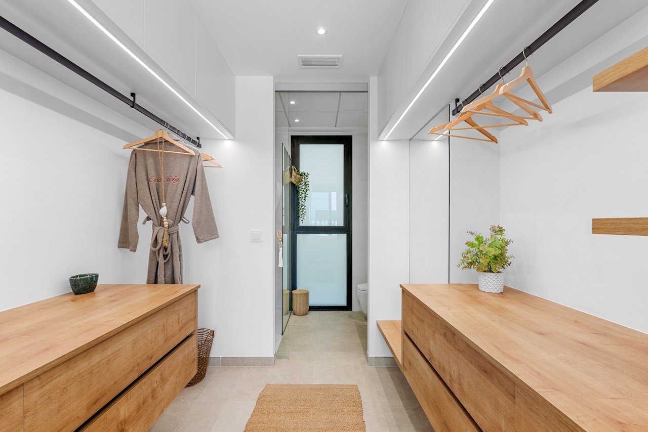 Die Ausstattung der Wohneinheiten beinhaltet unter anderem Aluminiumfenster mit Doppelverglasung und elektrischen Rollläden, Sicherheitstüren, Einbauküchen mit Elektrogeräten, Einbauschränke in den Schlafzimmern, Klimaanlage, Badezimmermöbel und -spiegel, Duschabtrennungen in den Bädern, Fußbodenheizung in den Bädern sowie LED-Beleuchtung im ganzen Haus. Darüber hinaus befinden sich auf jedem Grundstück ein Privatpool und ein Kfz-Stellplatz.