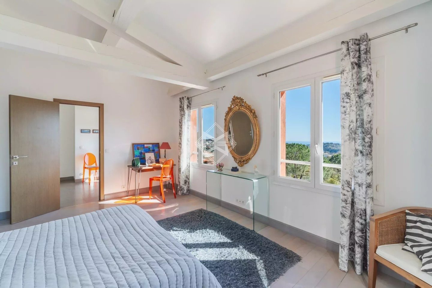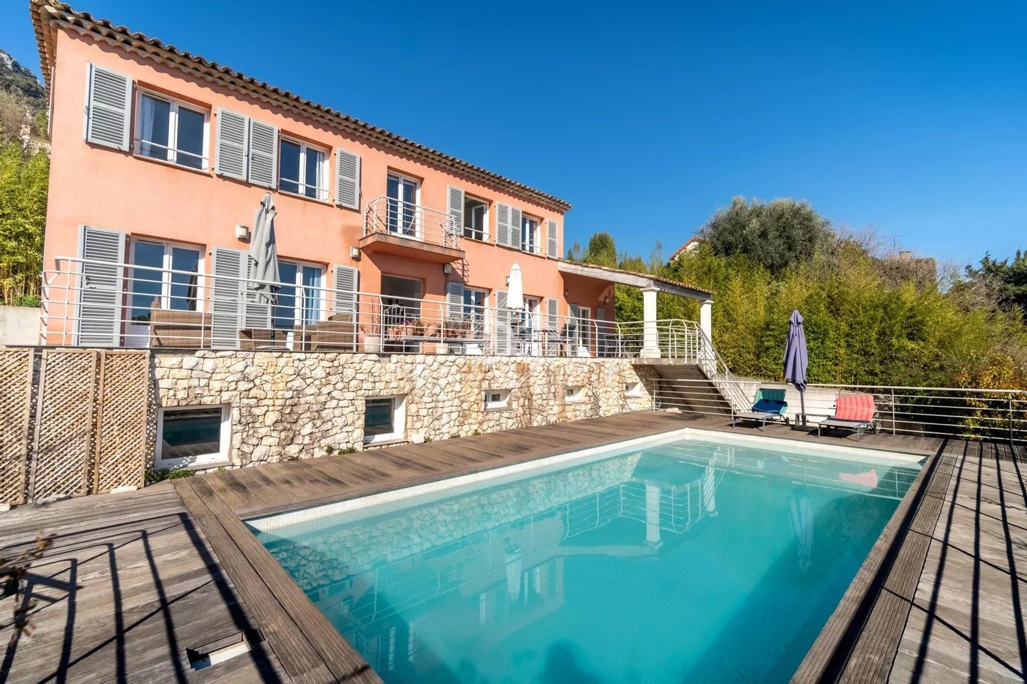 In einer ruhigen und privilegierten Umgebung gelegen, nur wenige Minuten vom Zentrum Vences entfernt, profitiert diese elegante provenzalische Villa von ca. 250 m² von einem schönen Blick auf die umliegenden Hügel bis hin zum Meer. Sie liegt auf einem gestalteten Grundstück von 4.560 m² mit einem schönen swimming pool, hinzu kommt ein angrenzendes Baugrundstück von 2.368 m², das ein seltenes Potenzial in der Region bietet. Die Villa erstreckt sich über drei Ebenen. Das Erdgeschoss beherbergt helle, lichtdurchflutete Wohnräume: Wohnzimmer, Esszimmer und eine moderne Küche mit zentraler Insel und Glasdach, sowie ein Schlafzimmer mit angeschlossener Dusche, alles öffnet sich zu einer großzügigen Terrasse von ca. 75 m², die das Panorama voll ausnutzt und direkten Zugang zum Pool ermöglicht. Im Obergeschoss besteht der Schlafbereich aus drei Schlafzimmern, darunter eine Suite mit Dusche und WC, während die beiden anderen sich ein Badezimmer teilen. Das Untergeschoss bietet zahlreiche zusätzliche Flächen: Hauswirtschaftsraum, großer vielseitiger Raum (Büro, Sport- oder Freizeitraum), Doppelgarage in Reihe, Stauraum und Technikraum. In der Nähe von Geschäften, Schulen und 20 Autominuten vom Flughafen Nice entfernt.