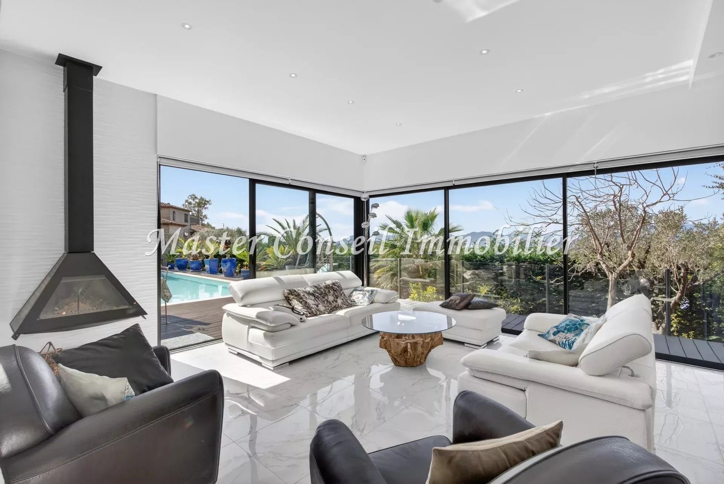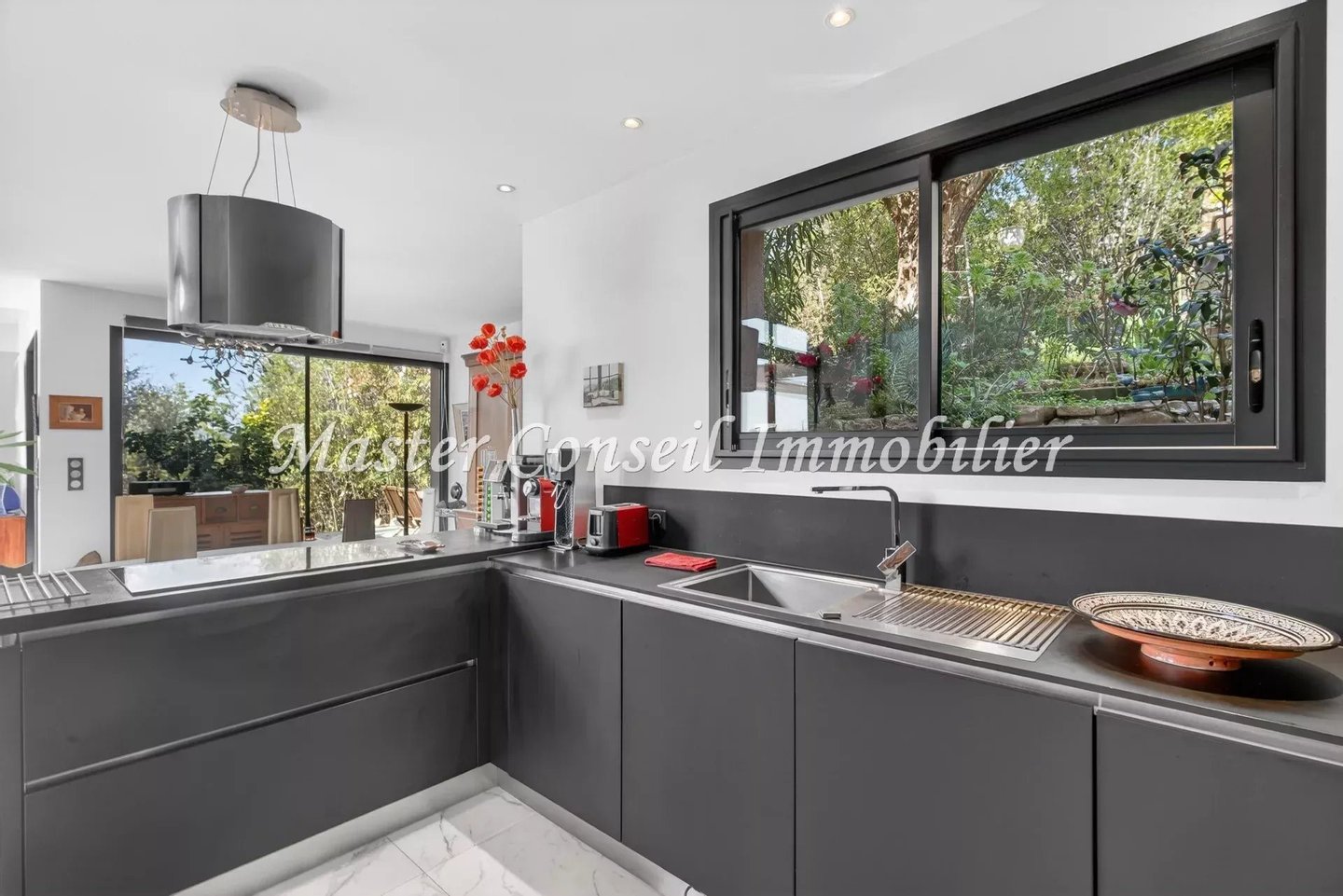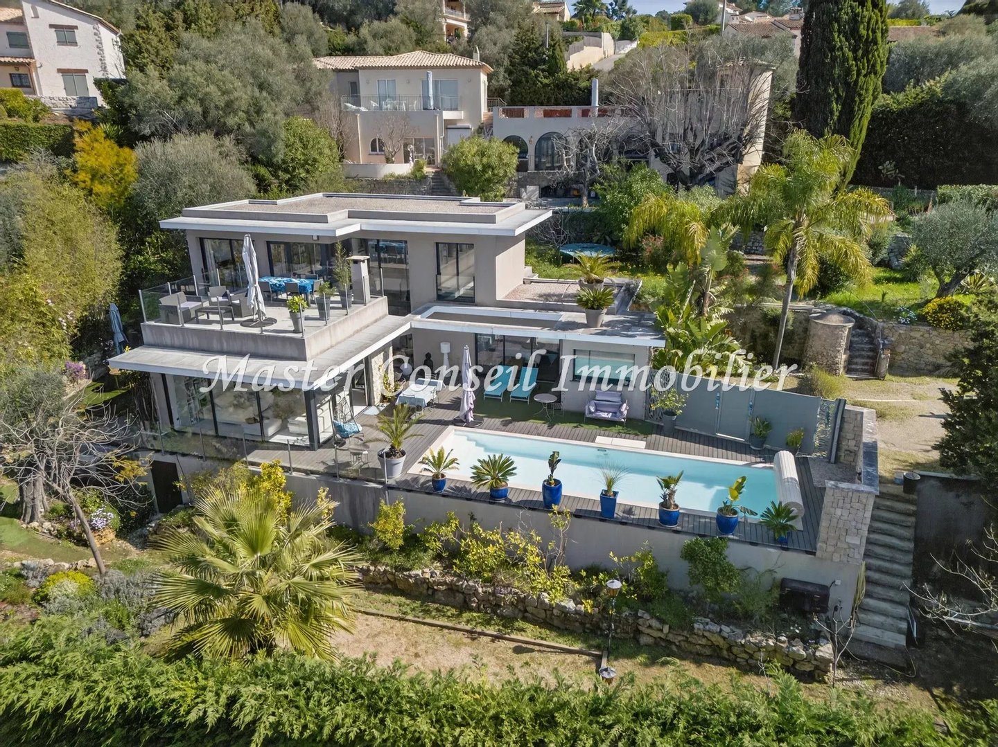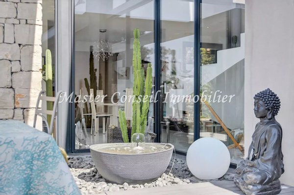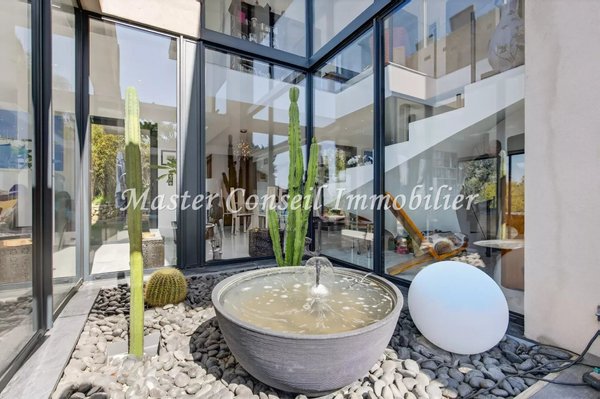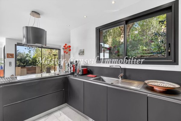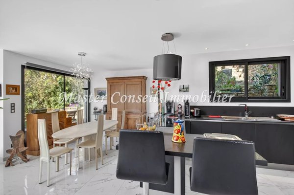 Exklusiv Co-Exklusiv: Mougins in einem Wohngebiet in Nähe des alten Dorfkerns und mit einfachem Zugang zu Cannes und dem internationalen Flughafen Nice. Standort in einer ländlichen Ecke ohne Gegenüber und in einer üppigen Umgebung. Wir bieten Ihnen eine moderne Villa mit 160 m² (140 m² Wohnfläche + 20 m² Nebenflächen), gebaut 2017, mit außergewöhnlicher Helligkeit, die nach draußen geöffnet ist. Drei sehr breite Terrassen umgeben diese Villa und blicken auf einen 1200 m² großen Garten mit mediterranen Gehölzen. Schon beim Ankommen vor dieser Villa erleben Sie eine authentische, grüne Umgebung. Nach Durchschreiten der Eingangstür betreten wir einen lichtdurchfluteten Raum mit großen bodentiefen Fenstern in einer „Zen“-Atmosphäre. Diese Villa besteht aus einer ebenerdigen, offenen Empfangszone mit Kamin, einer vollständig ausgestatteten Küche, einer Hauswirtschaftsraum, einem Schlafzimmer mit eigenem Badezimmer und Einbauschränken sowie einem Vorratsraum – ideal barrierefrei für Wohnen auf einer Ebene. Die 2 Terrassen am Pool und eine dritte, intimere Terrasse, verleihen der Villa ein umfassendes Wohlbefinden. Im ersten Obergeschoss befinden sich 3 Schlafzimmer mit Bad und Ankleideraum, die zu einer sehr großen schwebenden Terrasse mit außergewöhnlichem Panoramablick bis zum ESTEREL führen. Ein Gästeparkplatz für mehrere Autos und ein Keller ergänzen dieses Anwesen, in dem man sich sowohl drinnen als auch draußen sehr wohl fühlt. Maklerprovision 6 % inkl. MwSt, vom Käufer zu tragen, im Preis enthalten. Die Informationen zu den Risiken dieses Objekts finden Sie auf der Georisques-Website.