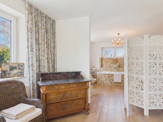 Das östliche Studio (ca. 35 m² Wohnfläche) besticht durch Saal-Charakter und eignet sich ideal als Bibliothek oder exklusives Office. Ein eigenes Tageslichtbad, Abstellflächen und ein weiterer Kaminofen machen diese Etage zu einem autarken Rückzugsort.