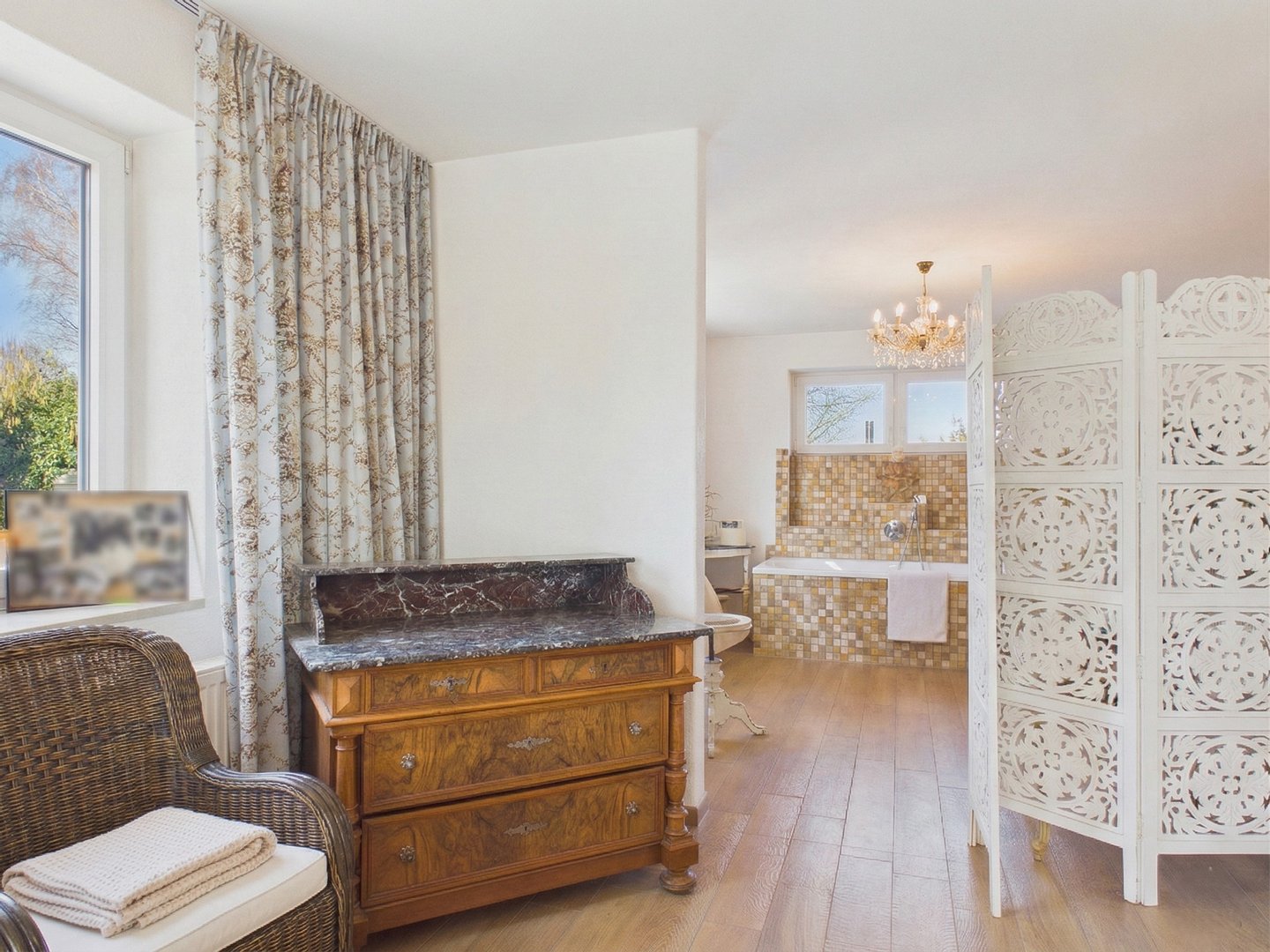 Wellness-Oase: Modernisiertes Bad mit Fußbodenheizung und Zugang zur uneinsehbaren Dachterrasse.