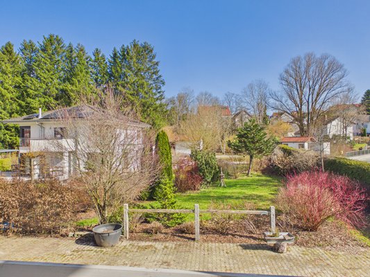 Außenbezug: Ein ca. 30 m² großer umlaufender Balkon bietet freien Blick auf den parkähnlichen Garten inklusive Koiteich und Fernsicht bis zum Ammersee.