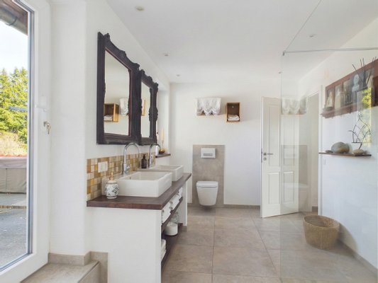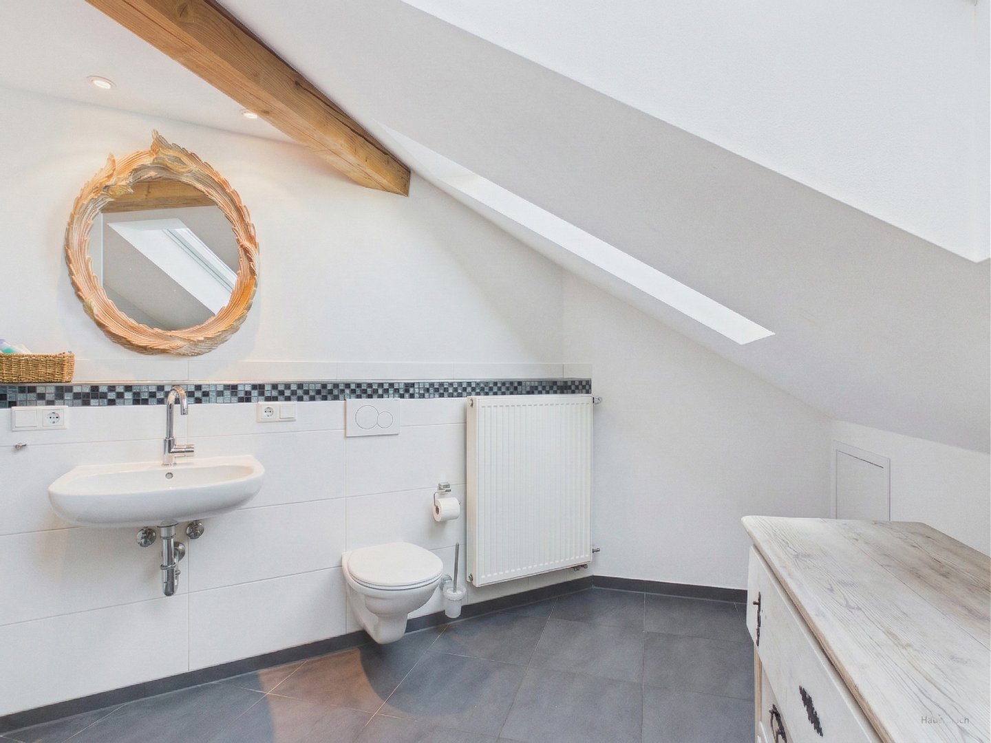 – Modernisiertes Badezimmer OG mit Fußbodenheizung, Badewanne, Dusche und Dachterrasse